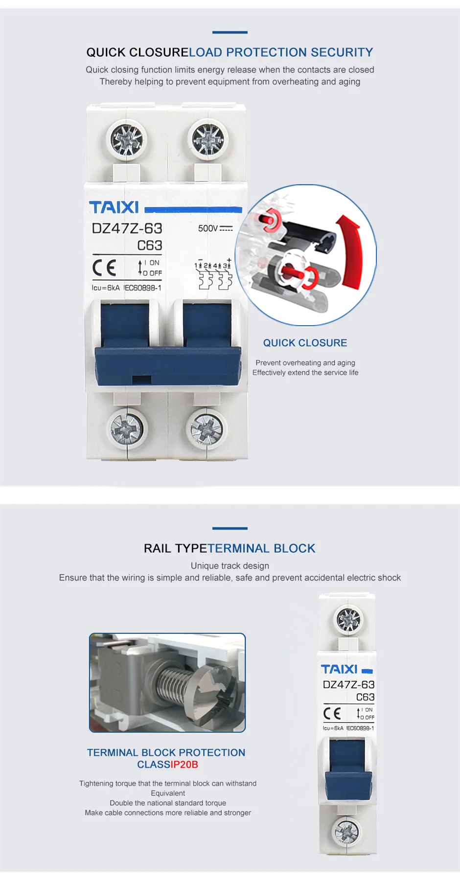 4. Новый DZ47Z имеет преимущества номинальной секции короткого замыкания до 6000A, 20 квадратных никелированных медных рядов (до 90 а тока) для серии, красивый внешний вид, медный ряд не подвергается воздействию, отверстие для винта имеет защитную крышку штепсельной головки.