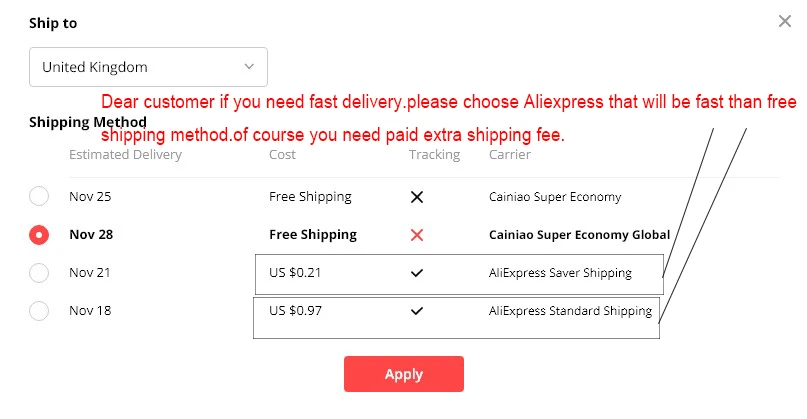 Примечание: Если вам нужна быстрая доставка, пожалуйста, выберите Aliexpress. Это будет быстрее, чем метод бесплатной доставки. Конечно, вам нужно оплатить дополнительную плату за доставку.