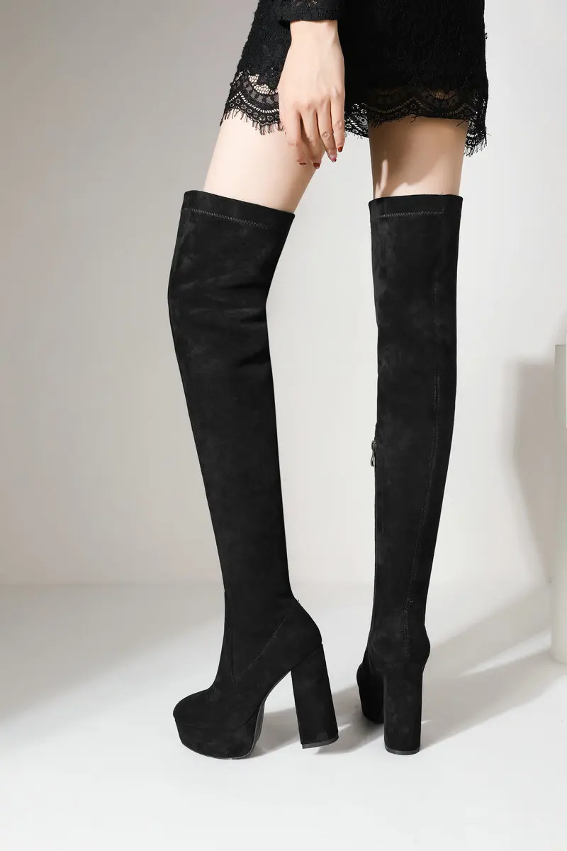 Высокие сапоги до бедра на платформе и толстом каблуке; Женские эластичные сапоги