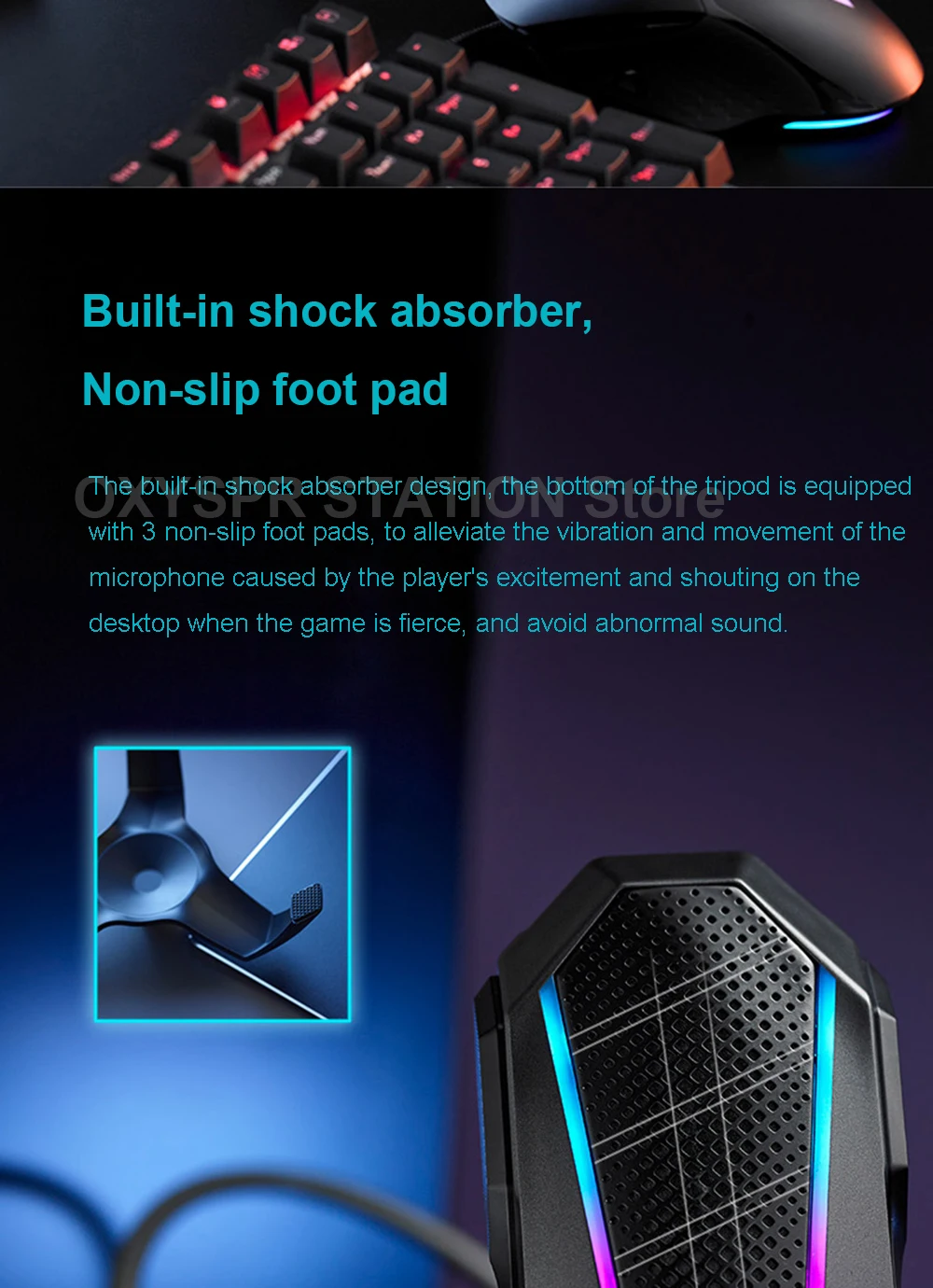Конструкция встроенного амортизатора, нижняя часть штатива оснащена 3 нескользящими накладками для ног, чтобы облегчить вибрацию и движение микрофона, вызванное волнением игрока и криком на рабочем столе, когда игра ожесточенная, и избежать ненормального звука.