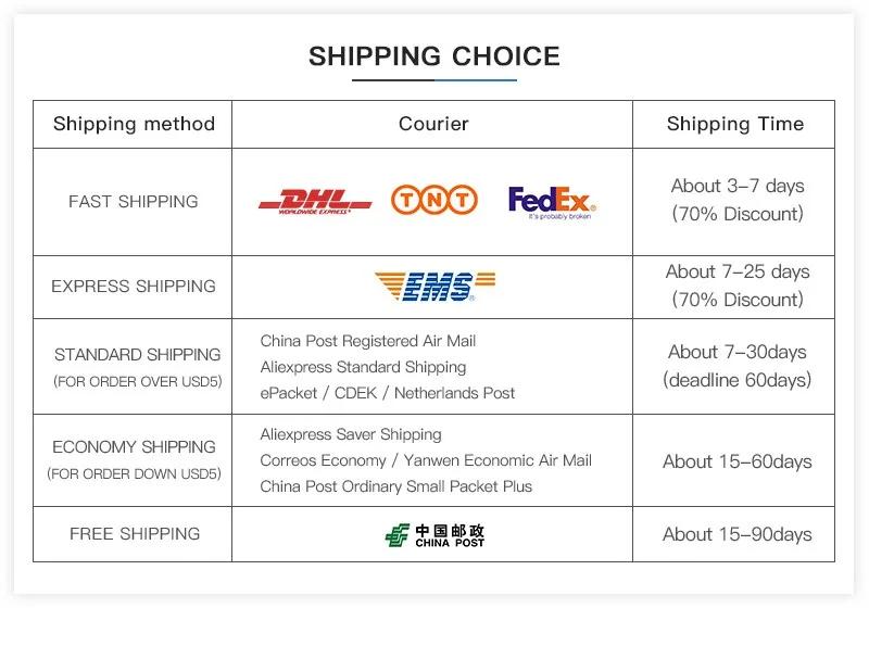 Способы оплаты: -Мы принимаем оплату всеми основными методами, в том числе Escrow, Alipay, T/T, Paypal, Western Union, по кредитным картам и так далее. Доставка: -Товары отправляются в течение 2 дней после получения Вашей оплаты.-Мы принимаем заказ на прямую доставку; мы можем отправить товар непосредственно Вашему клиенту.-Мы не несем ответственности за какие-либо наложенные НДС или таможенные сборы или налоги. -СРОК ДОСТАВКИ определяется службой доставки и не включает выходные и праздничные дни. Сроки доставки могут меняться, особенно во время курортного сезона. -Пожалуйста, будьте внимательнее при указании своего адреса заказа, который должен соответствовать Вашему адресу доставки. (Если Вы из России, пожалуйста, оставьте свое полное имя. Это очень важно) -Если Вы предпочитаете другие способы доставки, пожалуйста, свяжитесь с нами, большое спасибо. (Пожалуйста, обратите внимание: вы можете в таком случае понести дополнительные расходы, например, при экспресс доставке) Свяжитесь с нами: -Если Вы хотите разместить большой заказ на оптовую покупку, пожалуйста, свяжитесь с нами.-Если Вам необходимо сделать заказ на несколько позиций товаров, пожалуйста, сначала сообщите нам об этом. Мы можем предложить Вам скидку.-Пожалуйста, свяжитесь с нами или отправьте сообщение в АliExpress, если у Вас появятся какие-либо вопросы по оплате. Обратная связь: -Если Вы удовлетворены нашим сервисом или продуктами, пожалуйста, оцените наши услуги по шкале 5 звезд.-Если у Вас имеются вопросы, пожалуйста, свяжитесь с нами; мы свяжемся с Вами как можно раньше (в течение 24 часов)