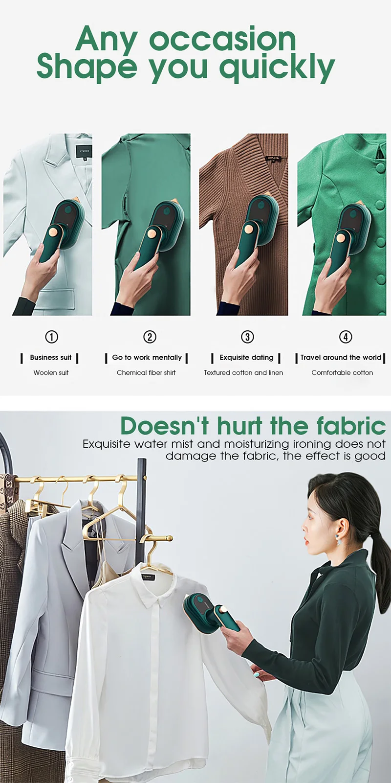 1. Сухая и влажная двойная глажка, универсальная, плоская глажка и подвесная глажка, совместима с мировым напряжением