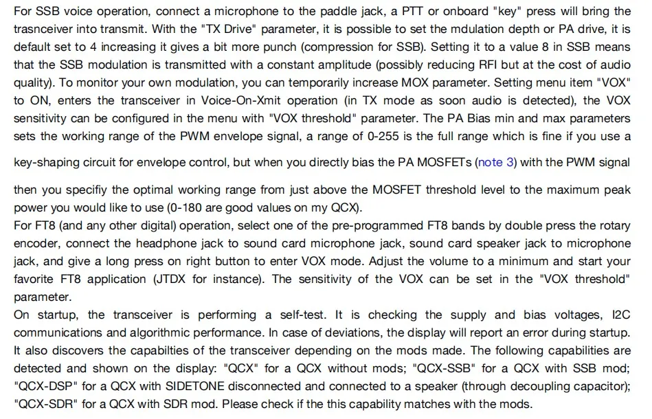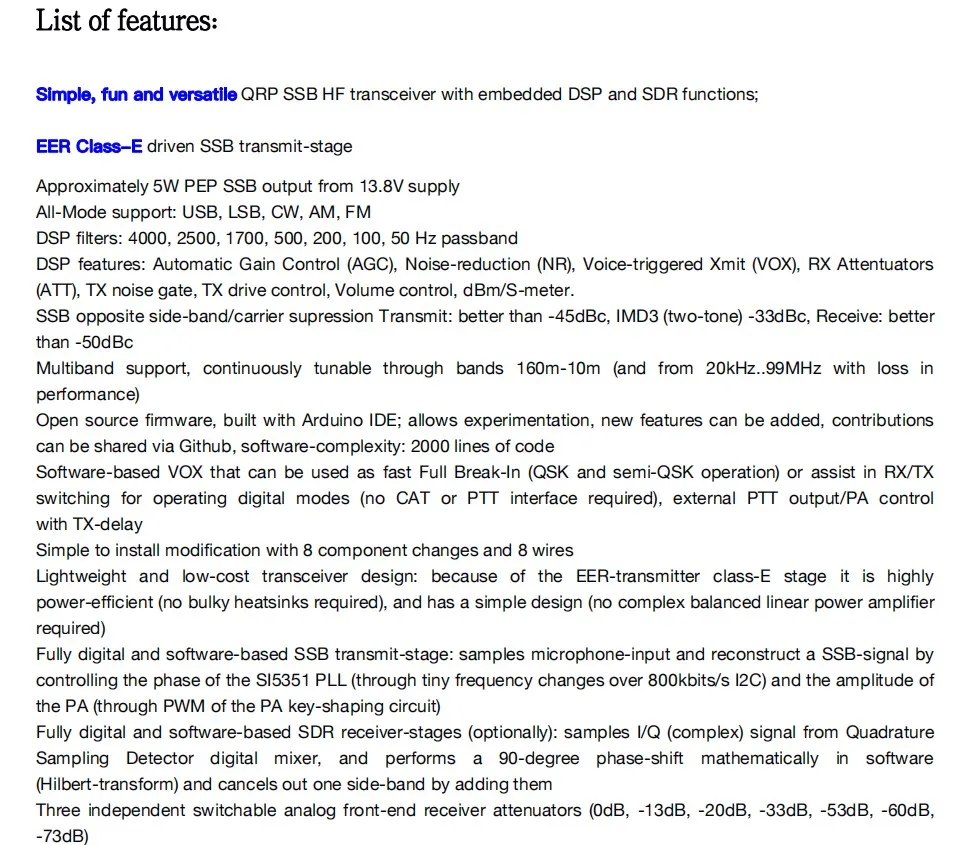 Он оптимизирован для QCX-SSB аппаратных средств с открытым исходным кодом. Мощное программное обеспечение поддерживает использование меньшего количества аппаратных средств для завершения SW трансивера и поддерживает режим SSB (качество приема очень хорошее, качество передачи немного хуже). Кроме того, разработчик также разработали для него режим AM/FM, но AM/FM определяется как функция подарка. Не ожидайте, что AM/FM слишком высокий.