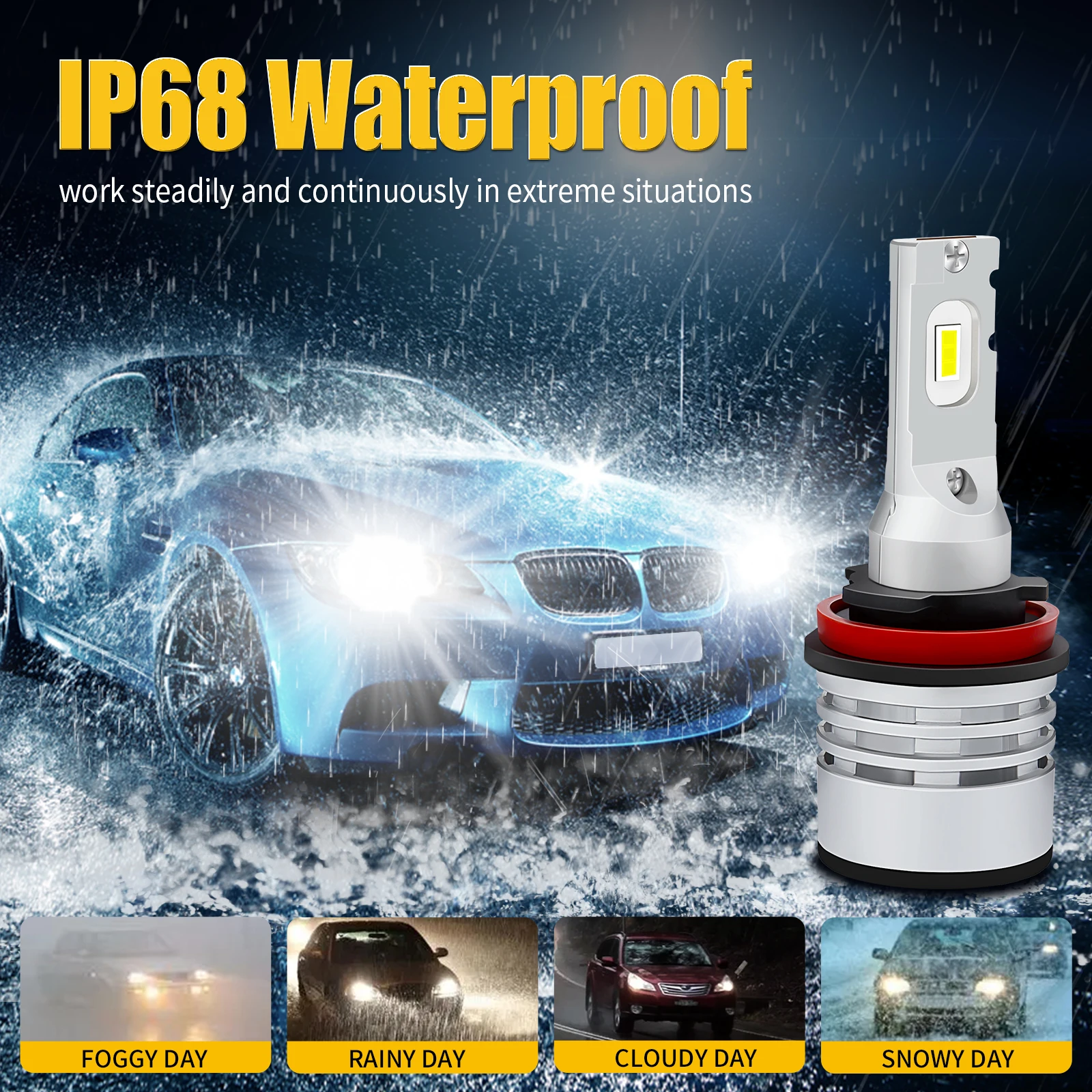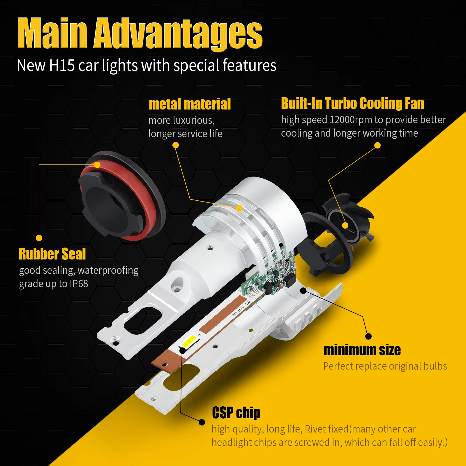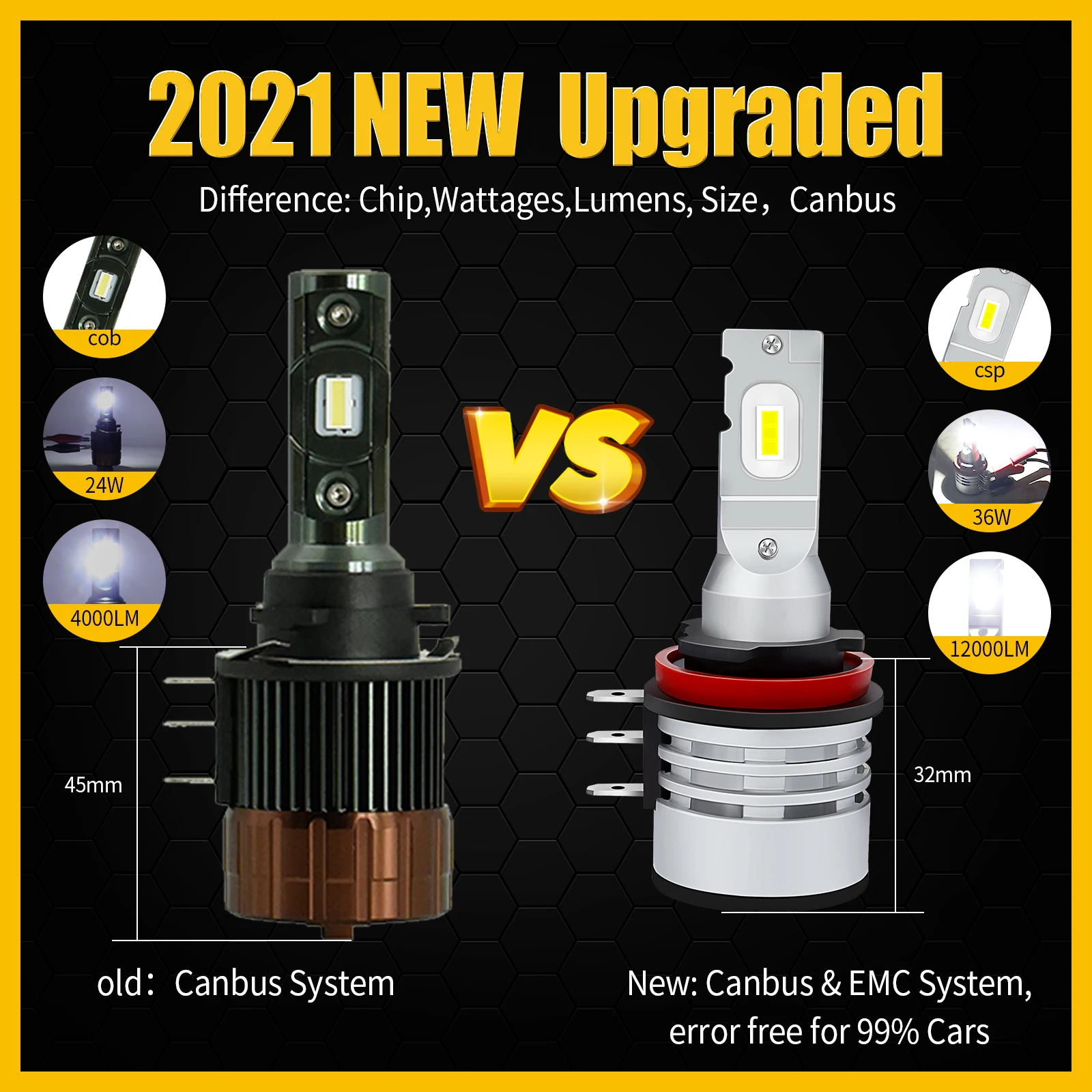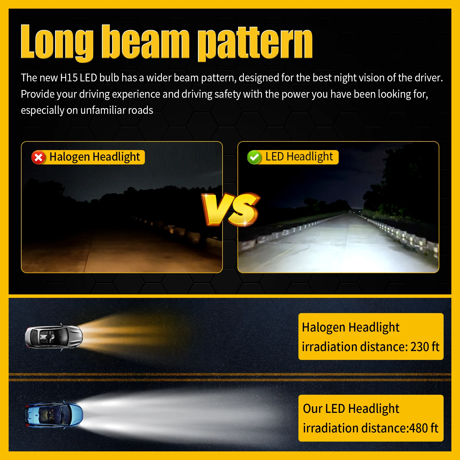 ● Использование новейшей технологии чипа CSP, до 72 Вт на пару, яркий белый светодиодный светильник 6500 К, на 500% ярче, чем оригинальные заводские галогенные лампы OEM, технология фокусировки луча, идеальный узор на светильник, нет темных пятен, по сравнению с оригинальной галогенной лампой, диапазон облучения длиннее, ярче и шире.