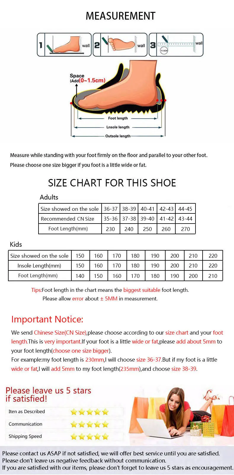 1. Мы отправляем китайские размеры (Китайский размер), пожалуйста, выбирайте в соответствии с таблицей размеров для этой обуви и длиной Вашей стопы, это очень важно. Если ваша стопа немного широкая или толстая, выберите на один размер больше (Добавьте примерно 5 мм к длине вашей стопы).