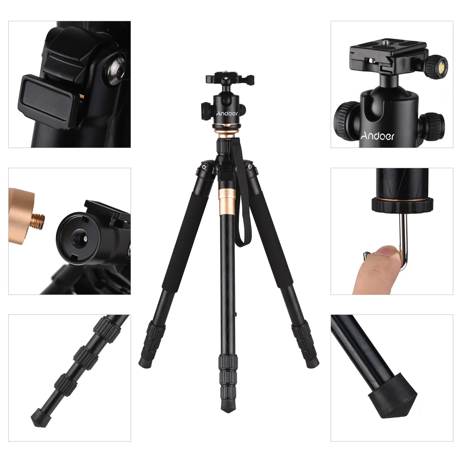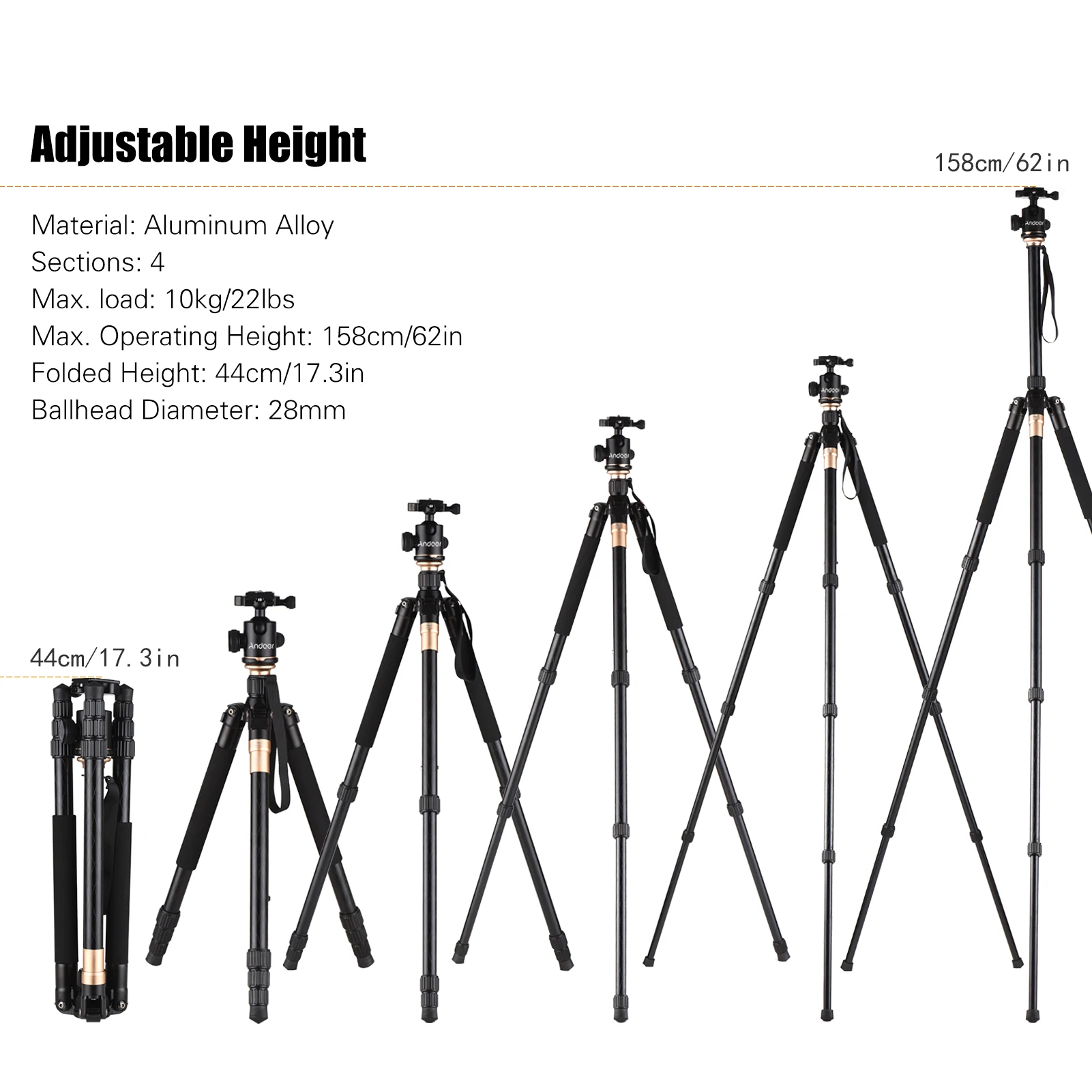 Регулируемая и стабильный штатив:4-х секционная телескопическая ножки для регулировки высота использования гибко, И максимальная высота до 158 см/62in; центр крюк для подвешивания дополнительный вес покрыта нескользким материалом резиновые ножки повышают устойчивость штатива.