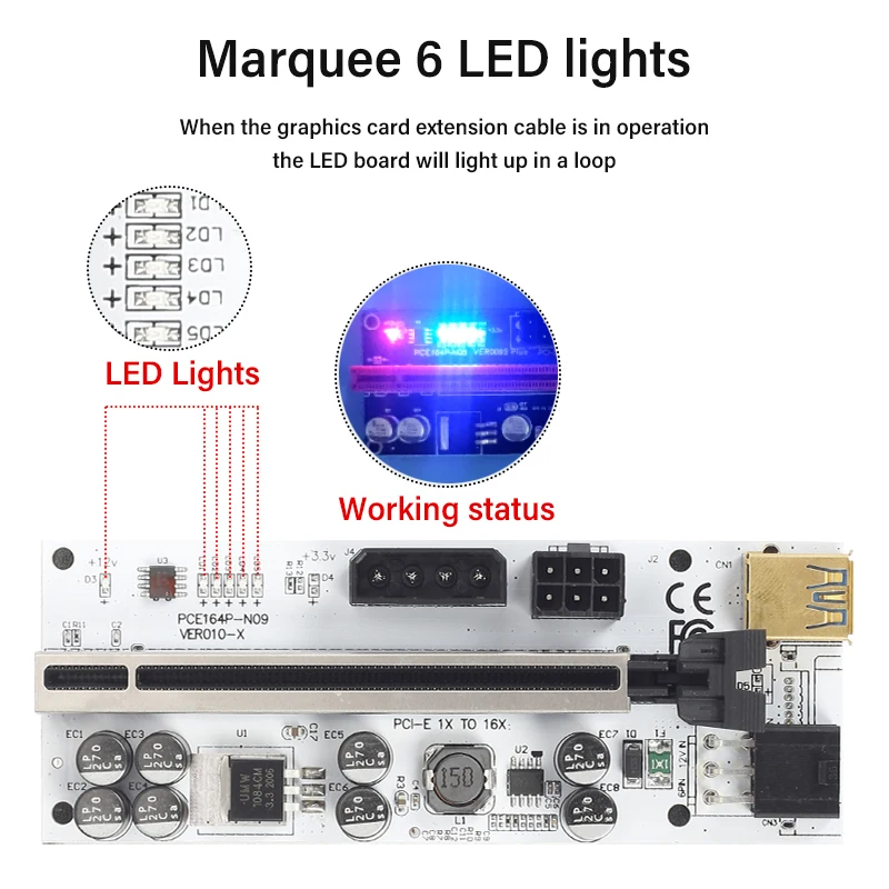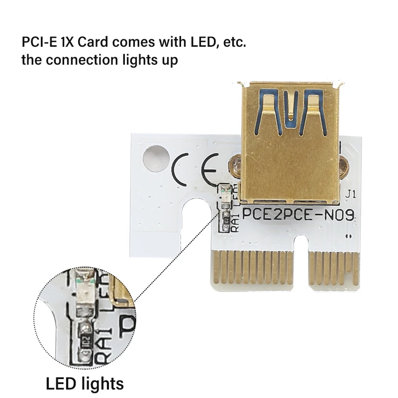 Наши доски толстые, что способствует долговечности и держанию карт без проблем. Пайка на нижней части каждой доски более обильная, предотвращая сокращение на досках и увеличивая долговечность во время добычи. Мощность через Molex или два разных 6-PIN входов на борту riser. На основной плате есть 6 светодиодный светильник s и один светодиодный светильник на чиповой плате 1X. Он может помочь шахтеру лучше контролировать неисправности.