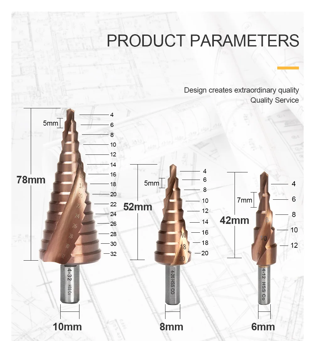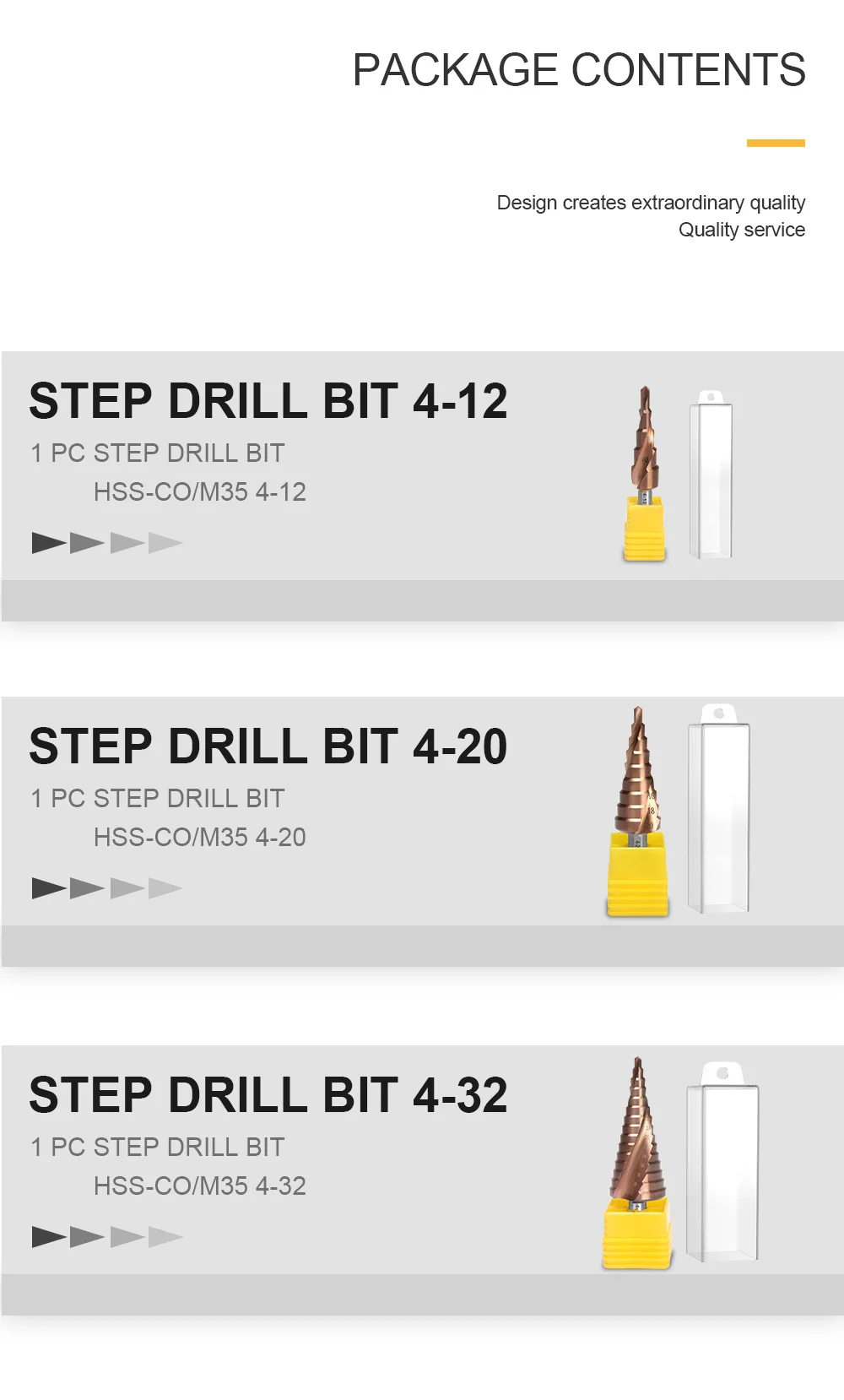ПрименениеСтупенчатые сверла подходят для нержавеющей стали/железа/меди/алюминия/пластика/дерева и других материалов.