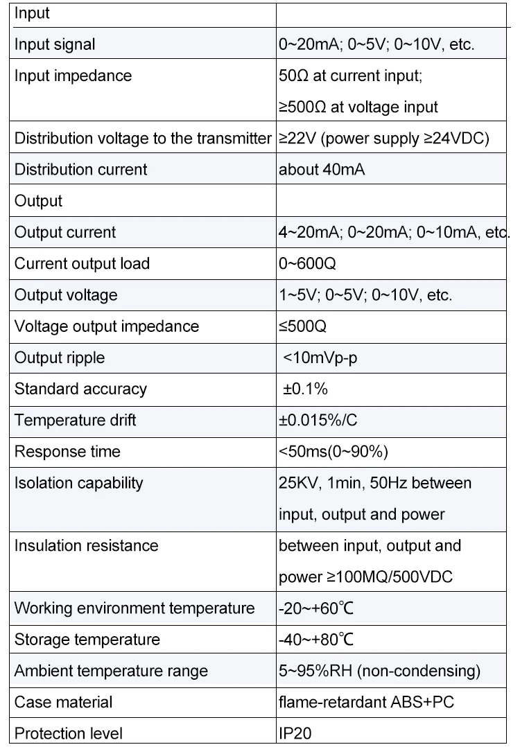Этот аппарат обеспечивает изолированный источник питания для полевого двухпроводного, трехпроводного передатчика и обнаруживает токовый сигнал в цепи между тем. Он передает входной ток или сигнал напряжения для изолированного тока или сигнала напряжения в цепи или двух изолированных цепях, а вход, выход и источник питания гальванически изолированы друг от друга.