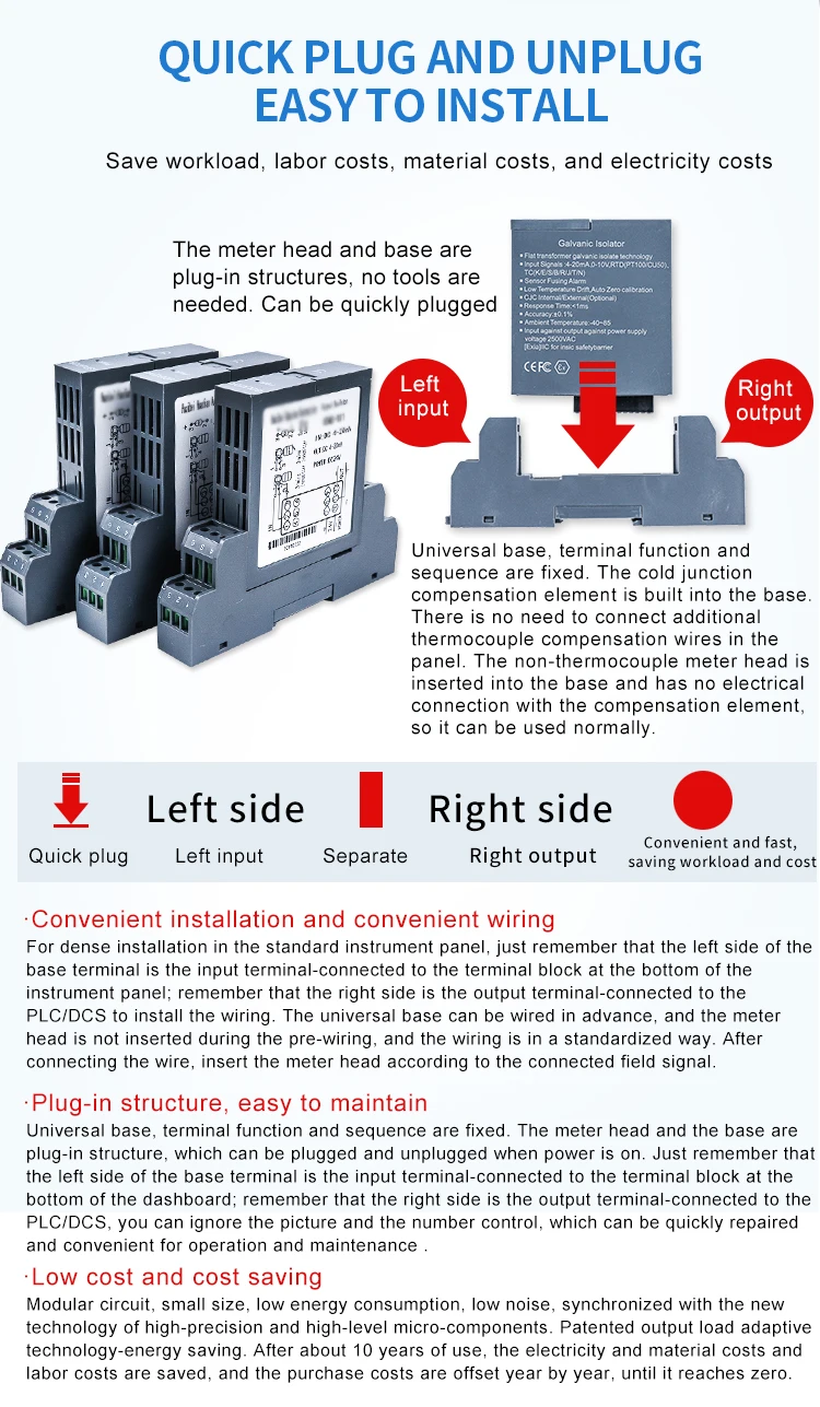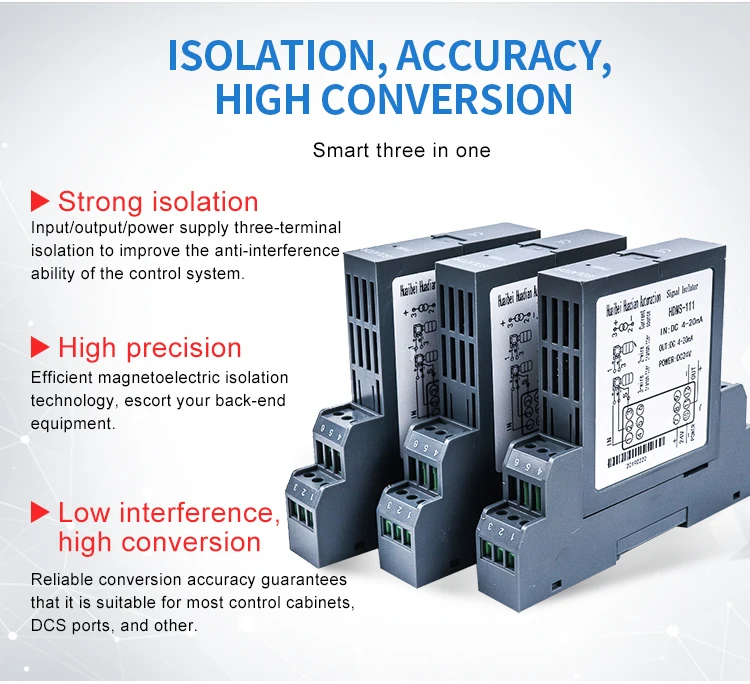 Его можно использовать вместе с модульными приборами и DCS, PLC и другими системами, чтобы предложить изоляцию сигнала, преобразование сигнала, распределение сигнала, обработку сигнала и другие функции для полевого инструмента, тем самым повышая иммунитет автоматической системы управления в промышленном производственном процессе и обеспечивая стабильность и надежность системы. Этот продукт имеет много разновидностей, таких как 1 В/1, 1 в/2, 1 в/4, 2 в/2, с магнитной изоляцией ввода/вывода.