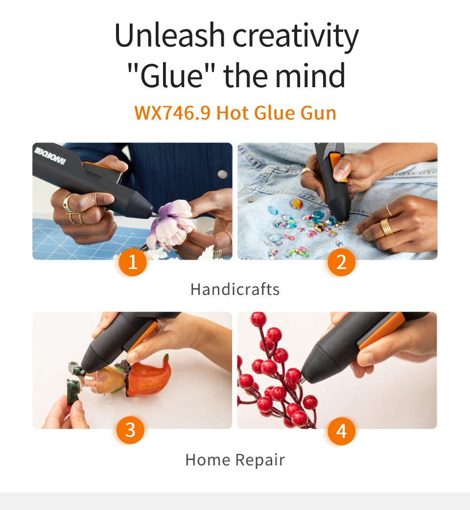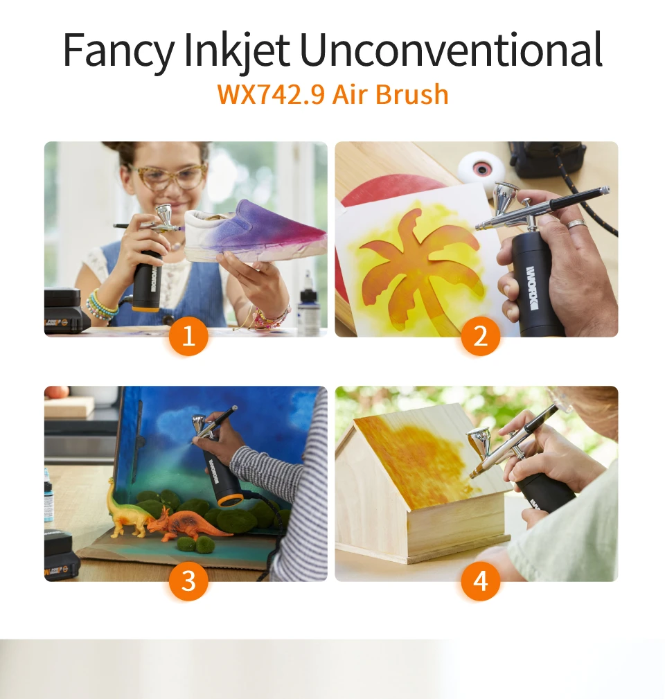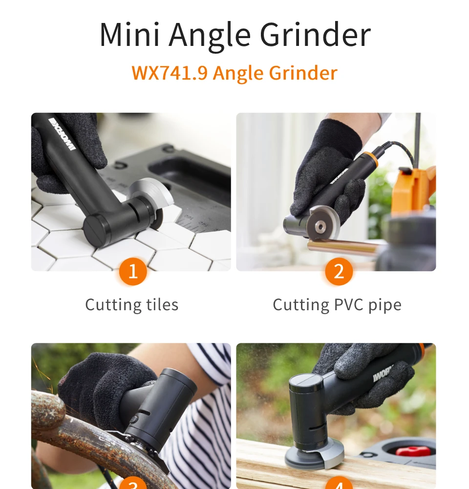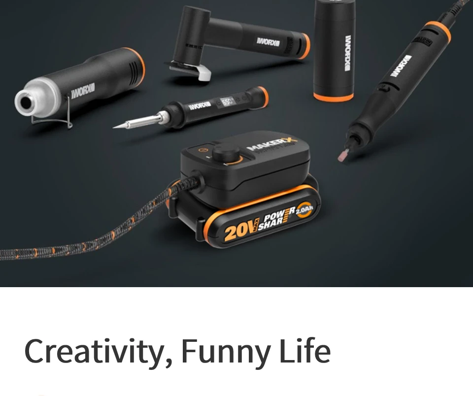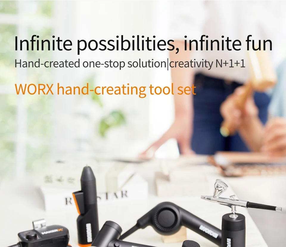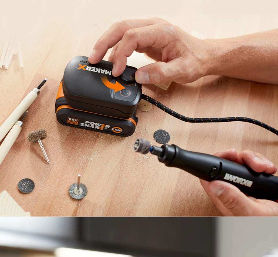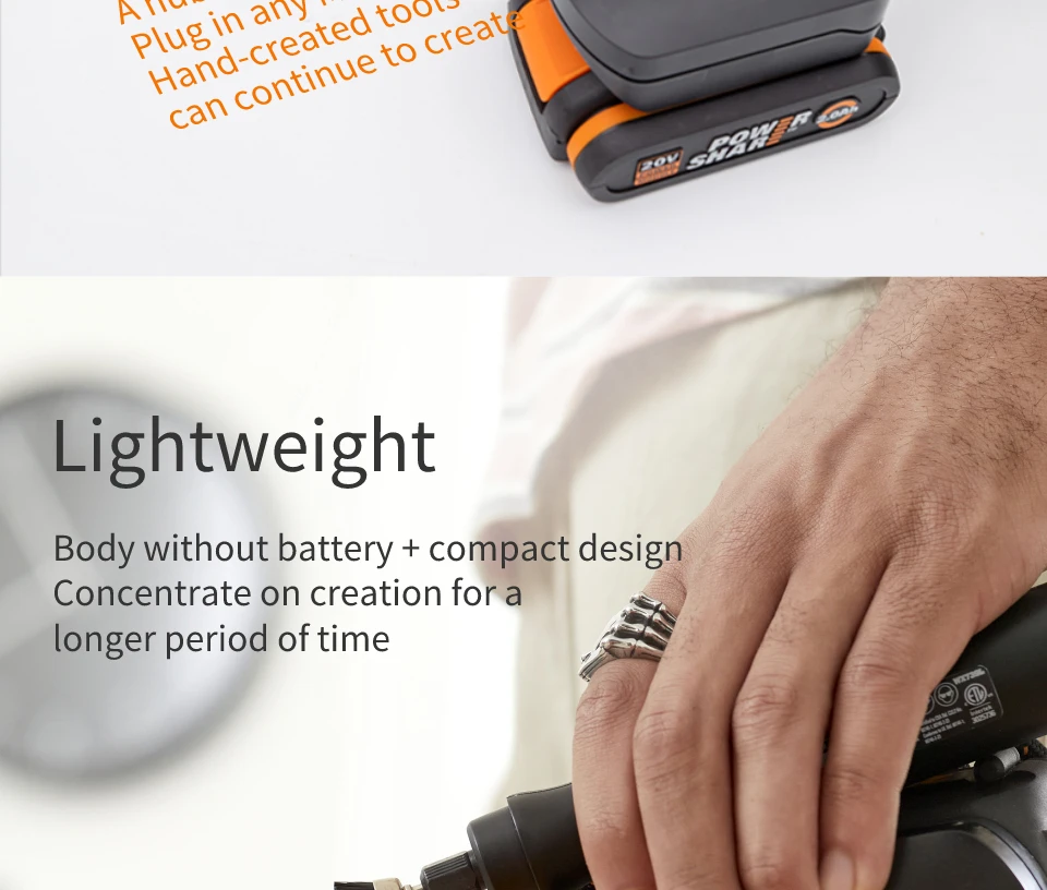 -[Сделано для производителей] небольшой по дизайну, но обеспечивает большую мощность. Мотор Worx MAKERX с бесщеточным (только WX739.9,WX741.9,WX747.9) хорошо помещается в вашей руке. И без бортового аккумулятора, он легче, так что вы можете работать дольше, не ощущая усталость в руках или плечах.