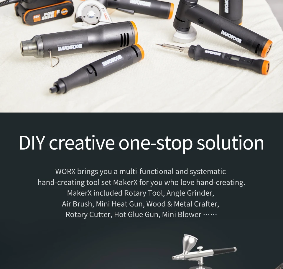 -[Тонкий дизайн корпуса] экстремально тонкий дизайн корпуса оснащен мягким соединительным кабелем к адаптеру, новый Worx MakerX подходит прямо в вашей руке, и Идеально подходит для деталей и замысловатой ручной работы; С эргономичным дизайном, все инструменты MAKERX не только легче захватывать и манипулировать, но и более удобно держать для длительных растяжек