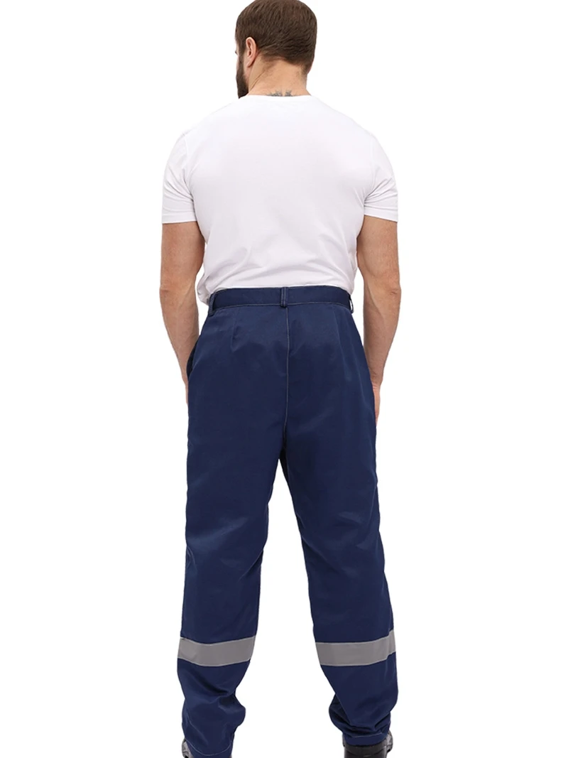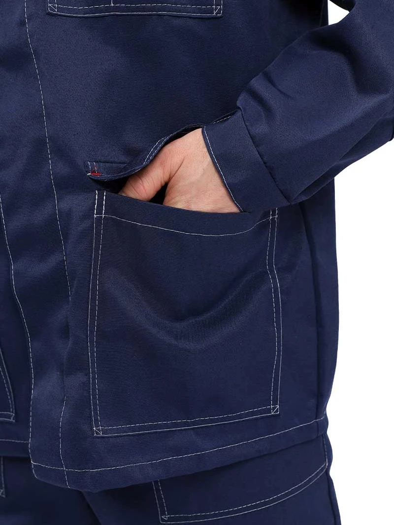 Костюм мужской летний, состоит из куртки и брюк. Куртка прямого силуэта – центральная супатная застежка на пуговицы, отложной воротник, кокетка полочек и спинки выделены светоотражающим кантом и широкой лентой СОП, нагрудный накладной карман на левой полочке, нижние накладные карманы с клапанами, рукав на притачной манжете с застежкой на пуговицу, усилительные накладки в области локтя. Брюки прямые, с притачным поясом со шлевками для дополнительного применения ремня, центральная застежка гульфик на петли и пуговицы верхние накладные карманы с косым входом, в нижней части брюк