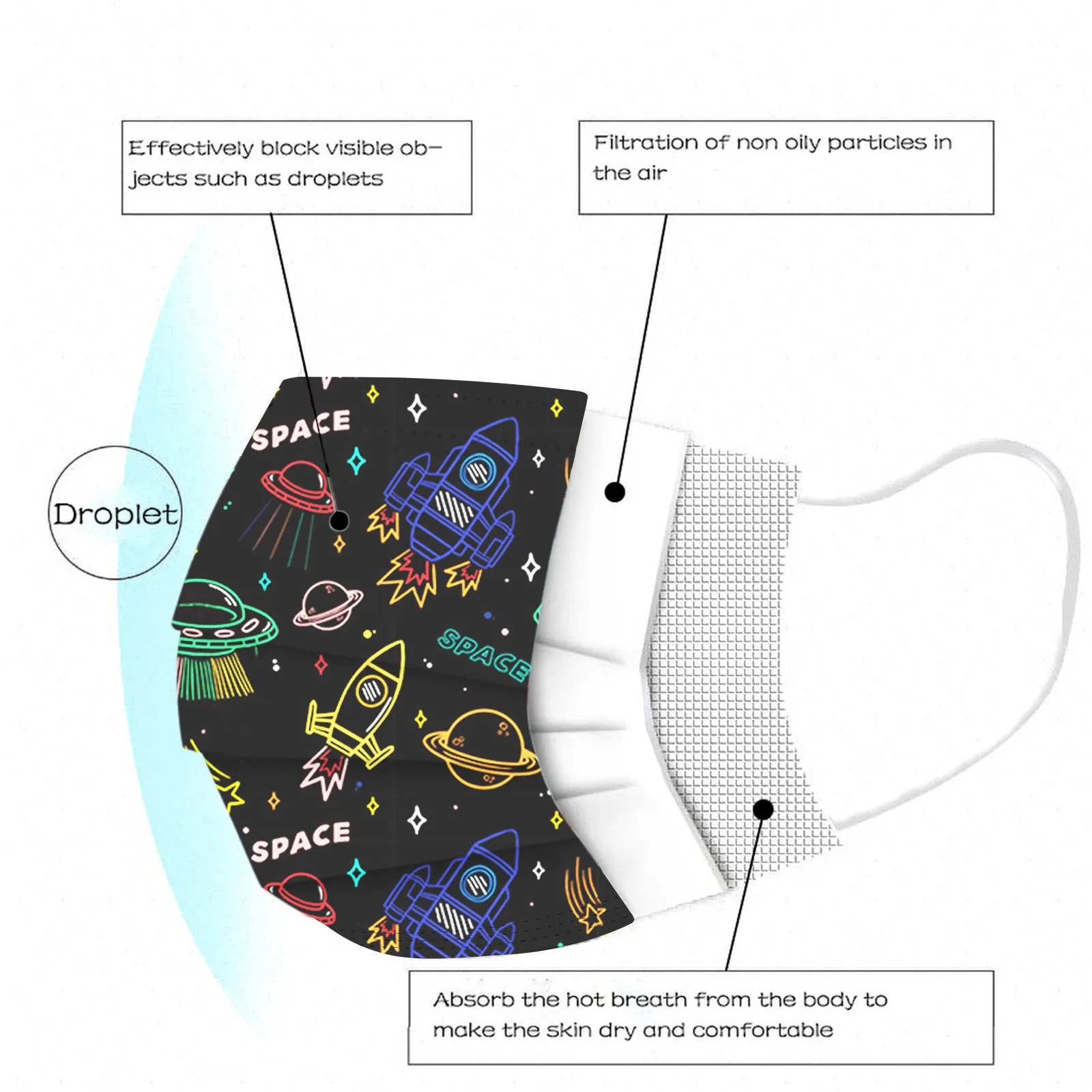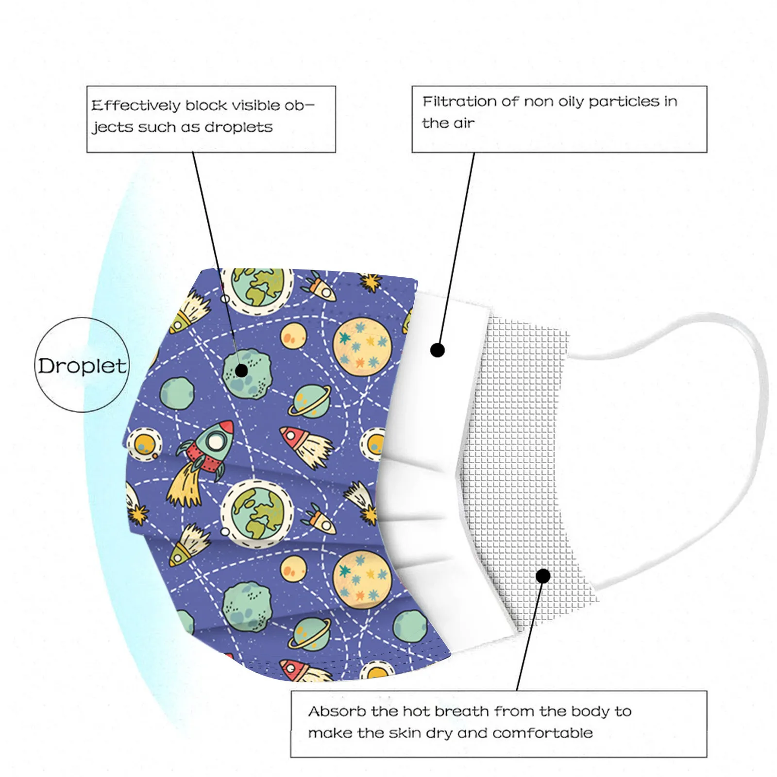 В 3 слоя Нетканая одноразовая маска изготовлена из 3 слоев нетканого материала, Безопасен и безопасен для использования. Дышащий материал и милый Узоры, которые делают его полезным и модным. Специальный 3 слоя из нетканого материала Дизайн, обеспечивает некоторую защиту от пыли, автомобильных выхлопных газов, Пыльца и т. д. эластичная Ушная петля, легко носить и не давит на уши. Маникюрный салон или любые другие области, где может потребоваться защита