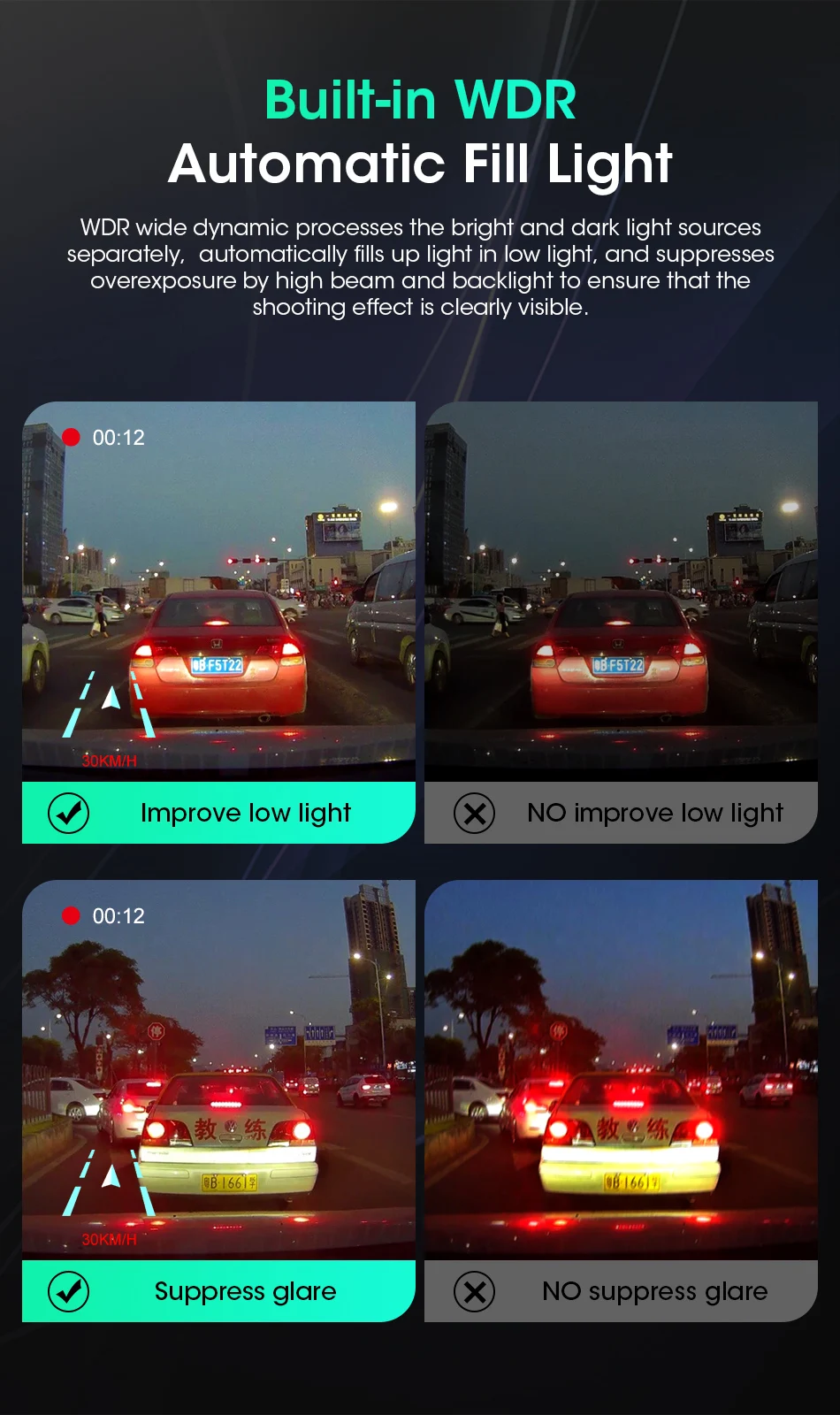 ● Основные характеристики: g-сенсор, циклическая запись, циклическая запись, покадровое видео, обнаружение движения, монитор парковки, отображение времени и данных, широкий динамический диапазон, изображение в картинке, вкл/Выкл автоматически