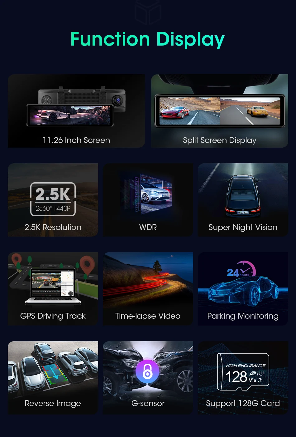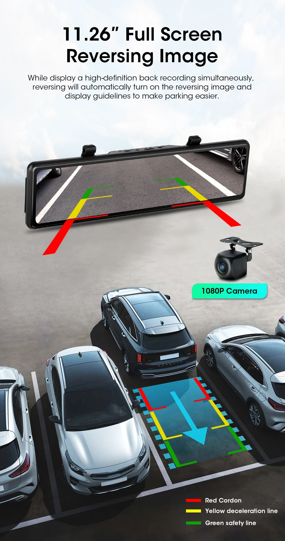 11,26 дюймовый большой экран, Раздельный экран одновременного отображения передних и задних дорожных условий, отсутствие слепых зон в поле зрения, вы также можете свободно отображать передние или задние изображения автомобиля отдельно.