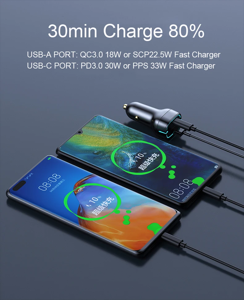 До 80% за 30 минут. Он будет заряжать два устройства одновременно со скоростью взлета.Каждый порт может достичь быстрой зарядки. Даже одновременная зарядка скорость быстрой зарядки двухпортового автомобильного зарядного устройства не будет зависеть друг от друга.