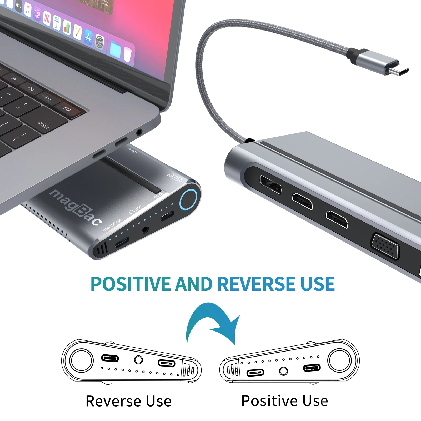 Двойная противоскользящая конструкция для столешницы, также может использоваться в качестве подставки для ноутбука; Независимо от того, находится ли порт USB C слева или справа от ноутбука, удобно подключаться.