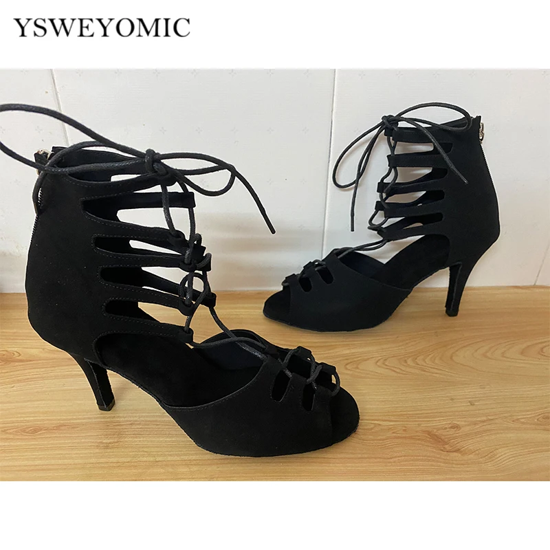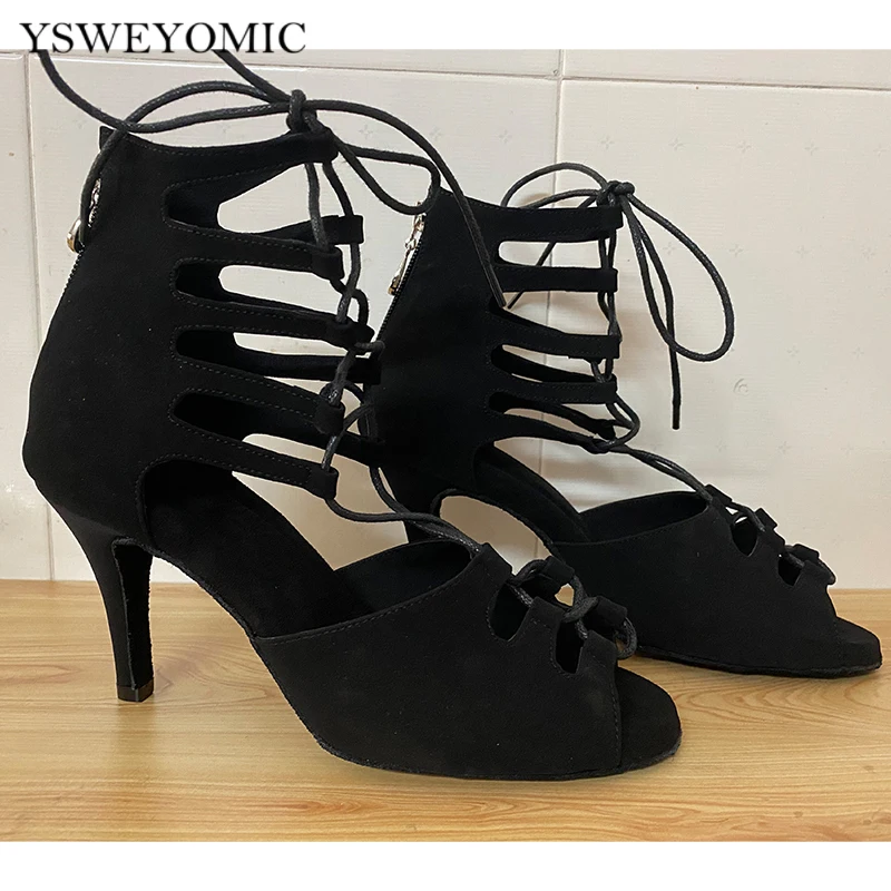 Черные танцевальные ботиночки Сальса Бачата, женская танцевальная обувь для латинских танцев, можно изготовить на резиновой подошве или Замшевой подошве для использования в помещении