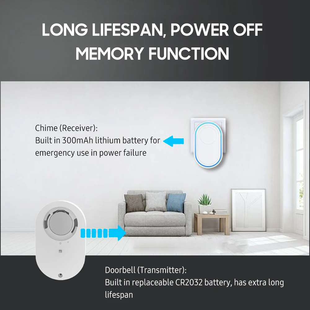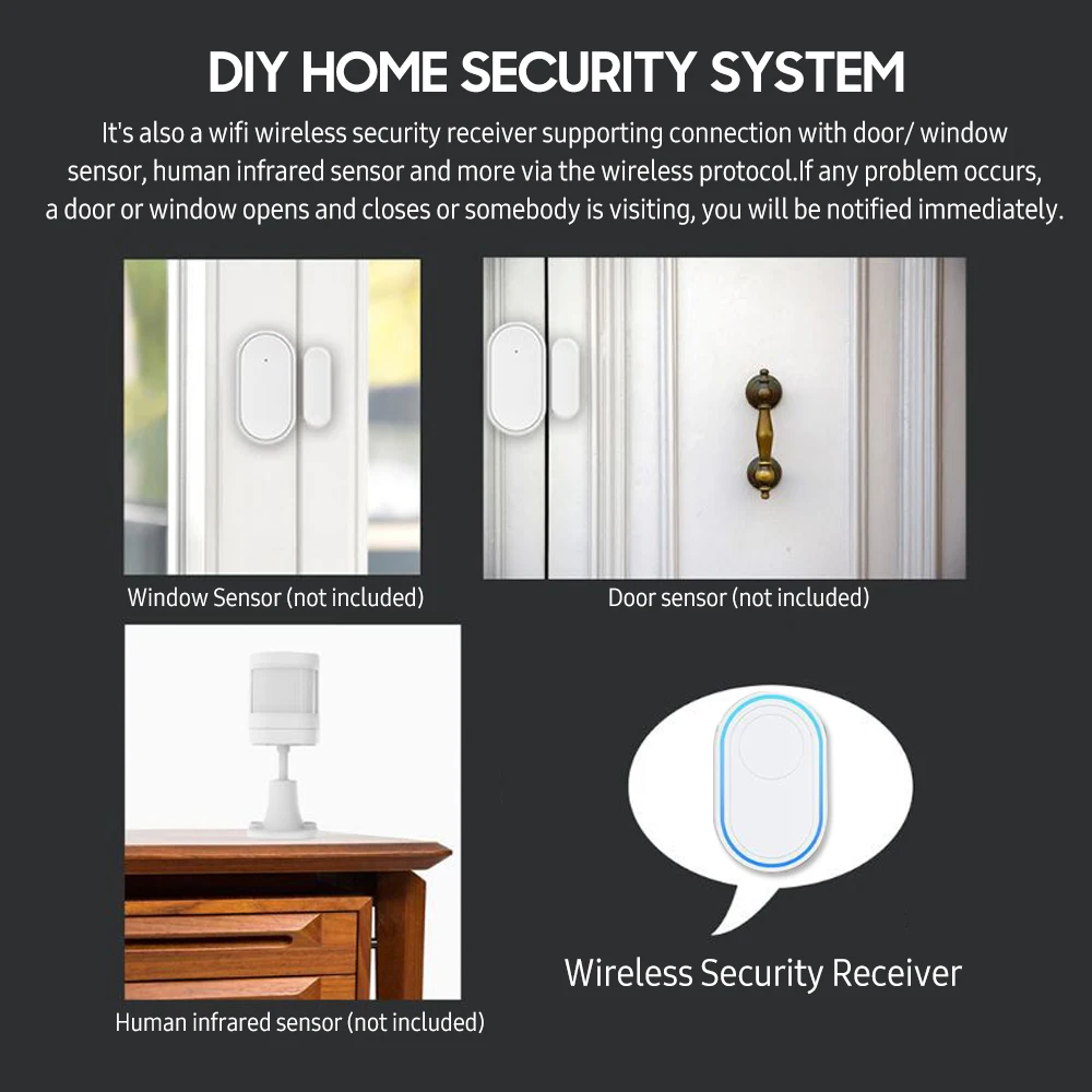 Когда Посетитель нажимает умный дверной звонок, звук активируется, и подключаемый сигнал будет звонить, чтобы напомнить вам. Он имеет 58 мелодий и 5 уровней громкости для выбора. Это также беспроводной приемник безопасности wifi, поддерживающий Подключение до 100 беспроводных датчиков и 10 удаленных тегов через беспроводной протокол. Умный дверной звонок обеспечивает домашнюю безопасность для вас, обеспечивая вам безопасность и удобство!