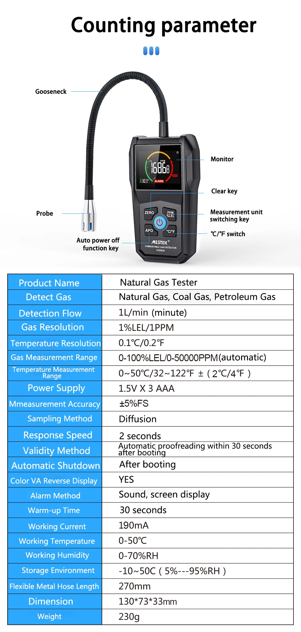 1. Диапазон измерения: 0-500 000ppm/0-100% LEL