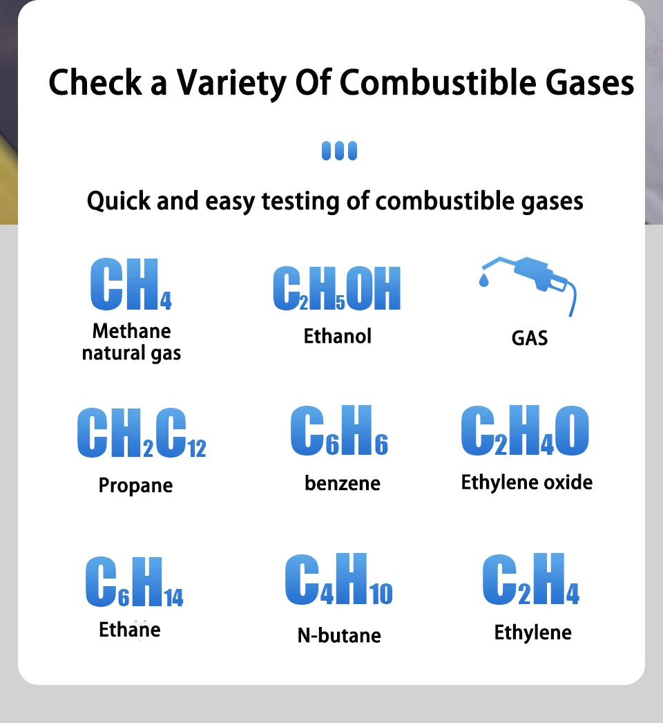 1. Измерение газа: метан, природный газ, бензин, спирт, пропан, бензол, трихлорэтан, Этан, n-бутан, галогенатедб углеводороды.