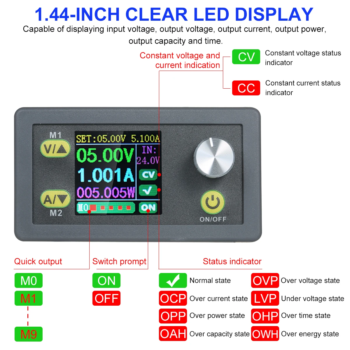 Благодаря нескольким защитным механизмам этот Программируемый Модуль питания постоянного тока мощностью 80 Вт небольшого размера отличается высокой мощностью, высокой эффективностью и стабильной производительностью. Оснащен 1,44 дюймовым светодиодный дисплеем, он может отображать напряжение, ток, мощность, емкость, время и другие параметры в режиме реального времени.
