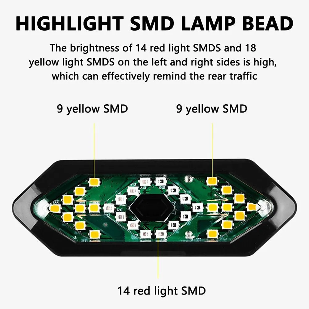 * 14 красный светильник SMDs и 18 желтый светильник SMDs на левой и правой сторонах имеют высокую яркость, что может эффективно напоминать о движении сзади.