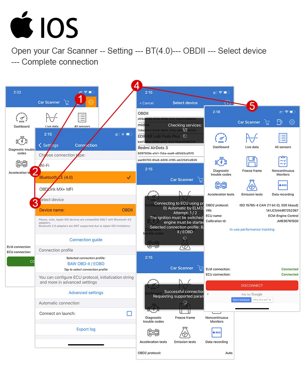 1. Откройте Автомобильный сканер -- Настройка --- Выберите тип подключения --- BT --- выберите BT устройство --- OBDII ---- возврат ---- автоматическое подключение.
