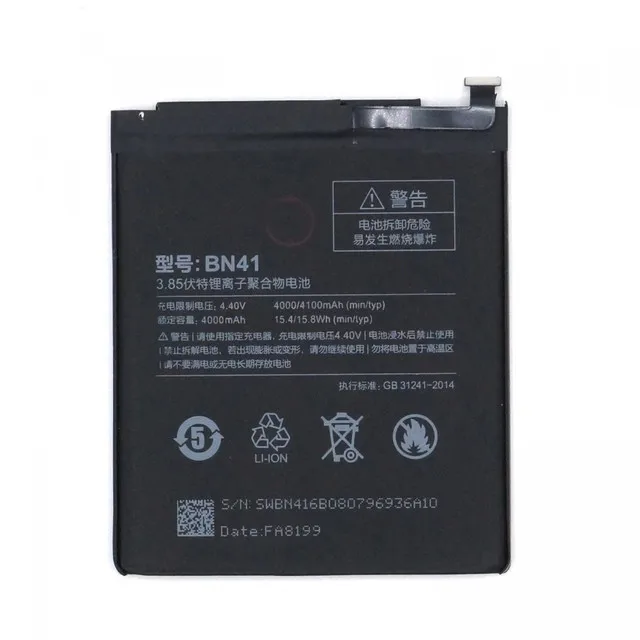 Номер модели BN41 Емкость батареи (мА*ч)* 3501 мАч-5000 мАч Напряжение 3.85V Температура хранения от –20 до +45 °C Температура эксплуатации от 0 до +35 °C Совместимость Redmi Note 4, Redmi Note 4 ProДополнительные изображения