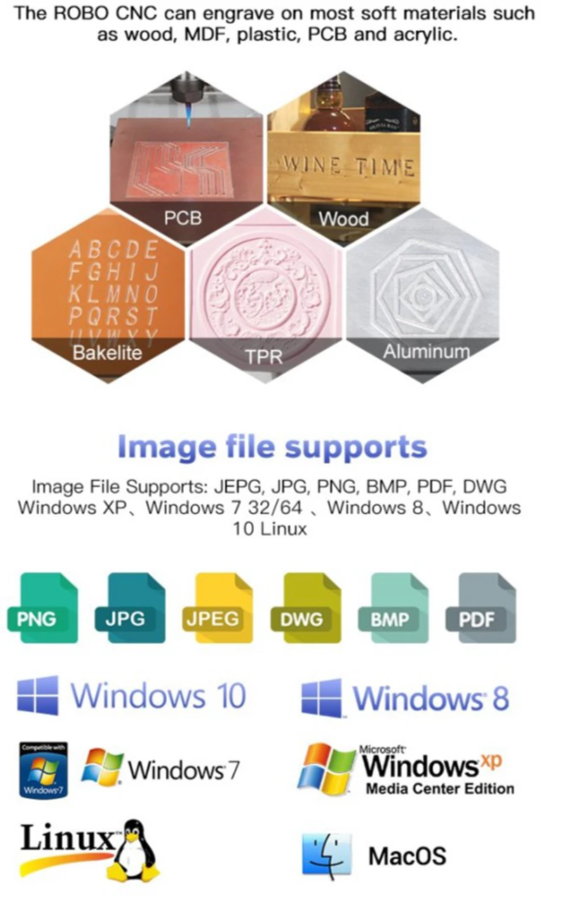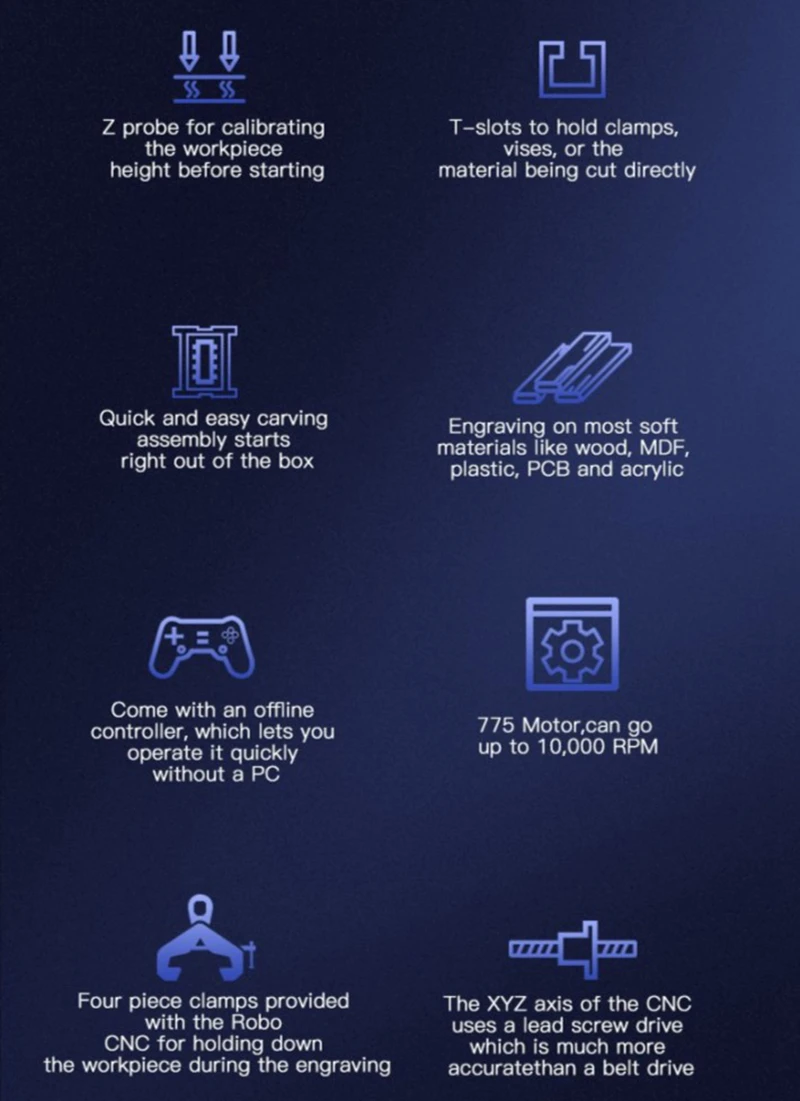 Маршрутизатор ROBO CNC имеет эффективную площадь гравировки300*180*45 мм (11,8*7,1*1,8 дюймов). Гравер с ЧПУ может использоваться с алюминием, деревом, акрилом, печатной платой, TPR и т. д.