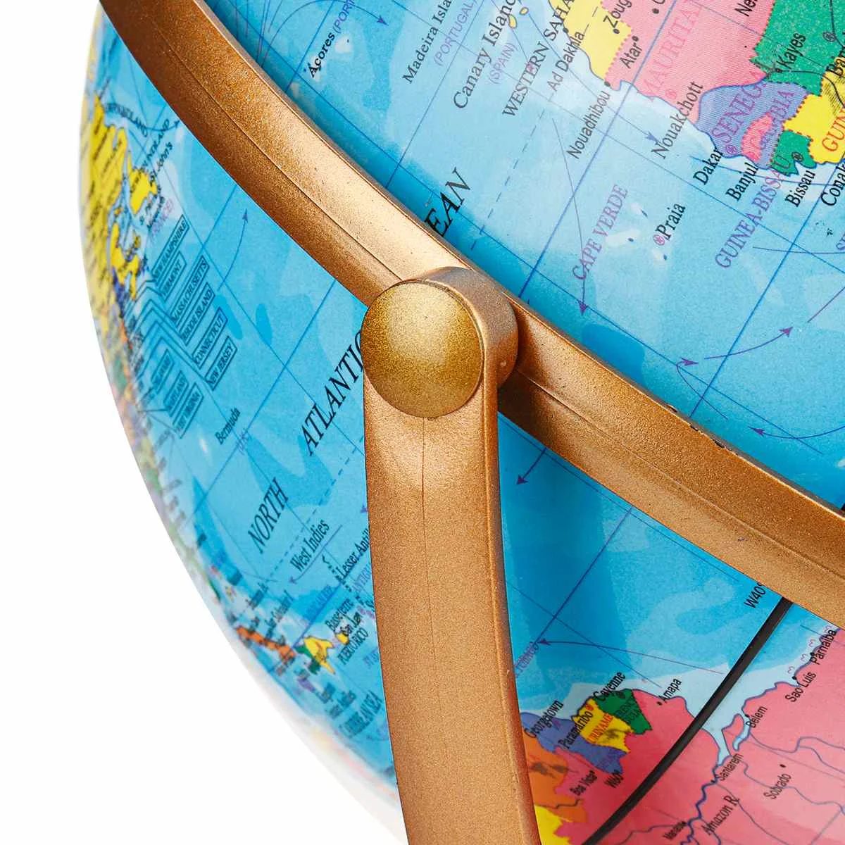 Глобус удерживает полумеридиан, установленный на прочной пластиковой основе золотого цвета.