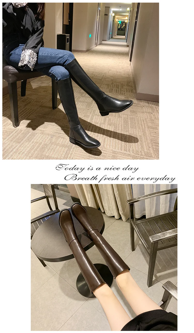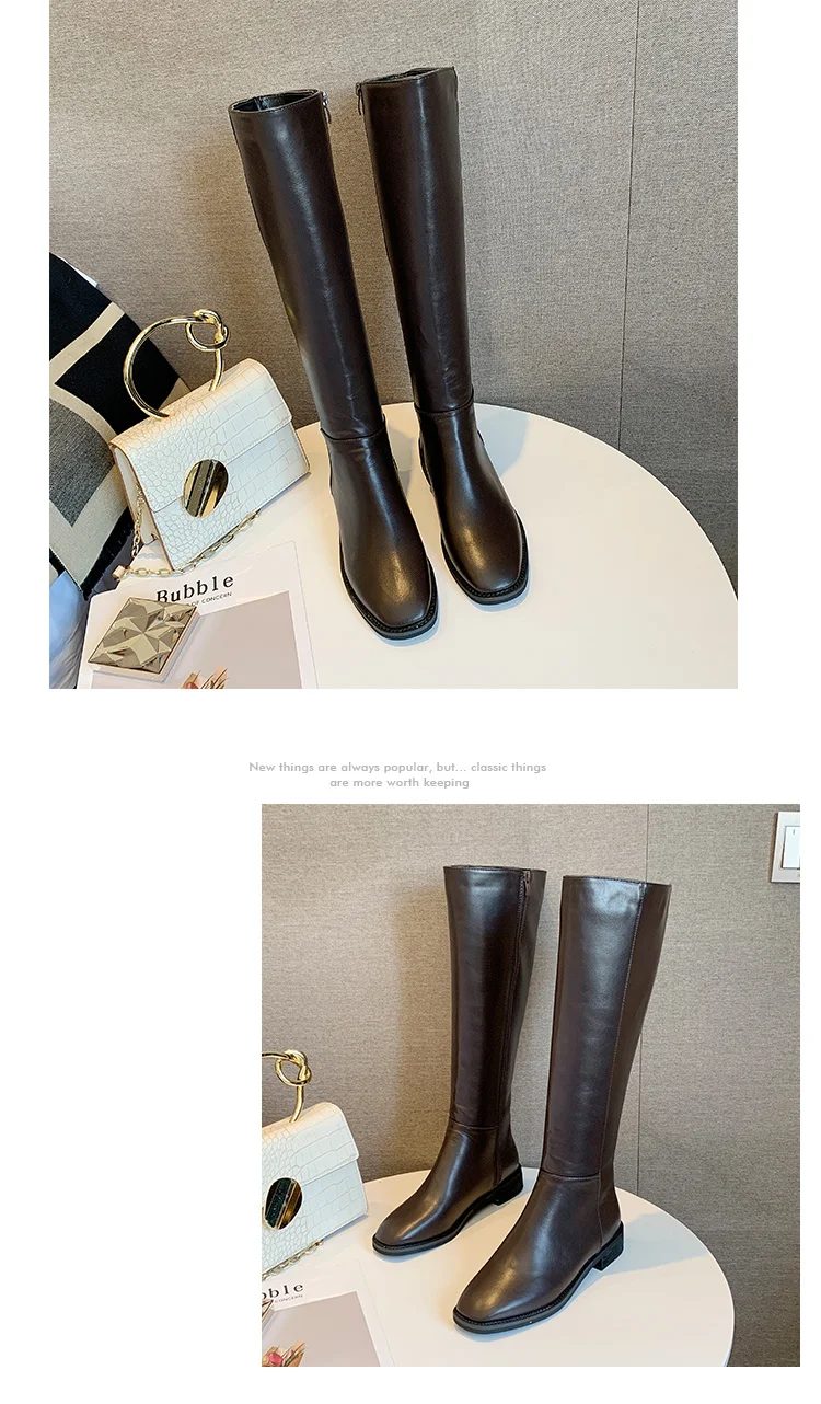 Новинка 2021 года; Зимние кожаные женские сапоги до колена; Обувь с квадратным носком на молнии сбоку; Женские сапоги для верховой езды на низком каблуке; Женские высокие сапоги