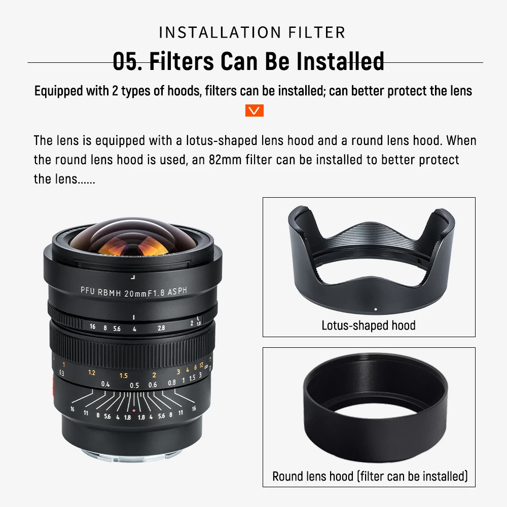 Оснащен 2 типами капюшонов, фильтры могут быть установлены; Может быть более горячей защиты объектива.