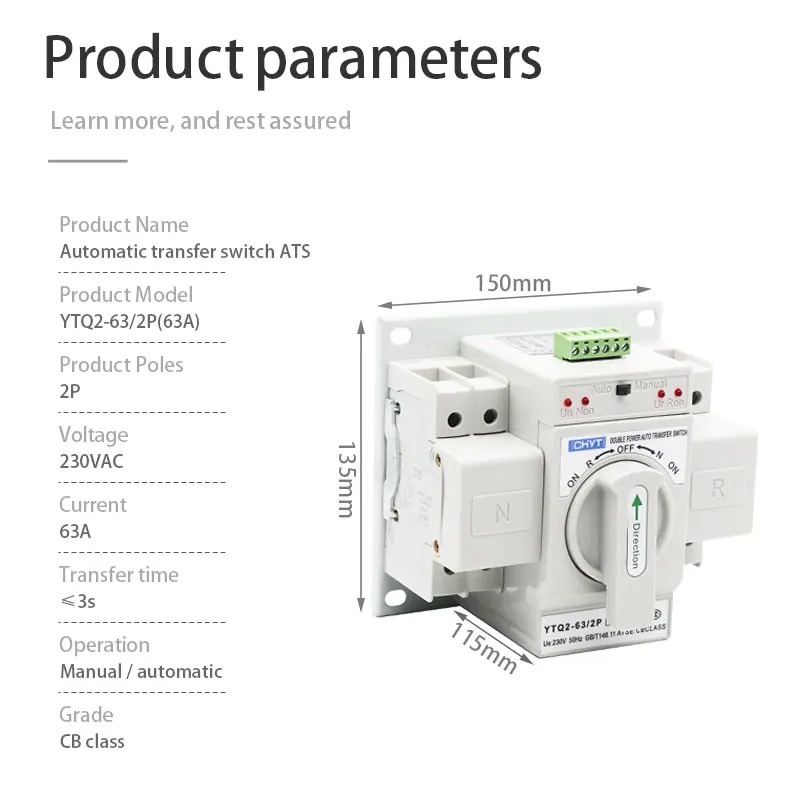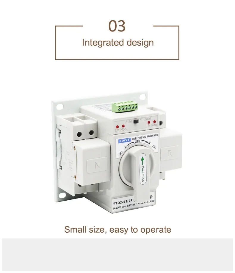 YTQ2-63 микро-разрывной двойной переключатель передачи питания (далее-переключатель передачи) подходит для переменного тока 50/60Hz двойной Мощность система подачи с Номинальное рабочее напряжение 230V/400V и номинальный рабочий ток формы 63A. Дополнительная передача двойной мощности может быть произведена в соответствии с требованиями. Продукт имеет функцию короткого замыкания, а также противопожарную защиту, двойной разрыв и выход на сигнальной функции.