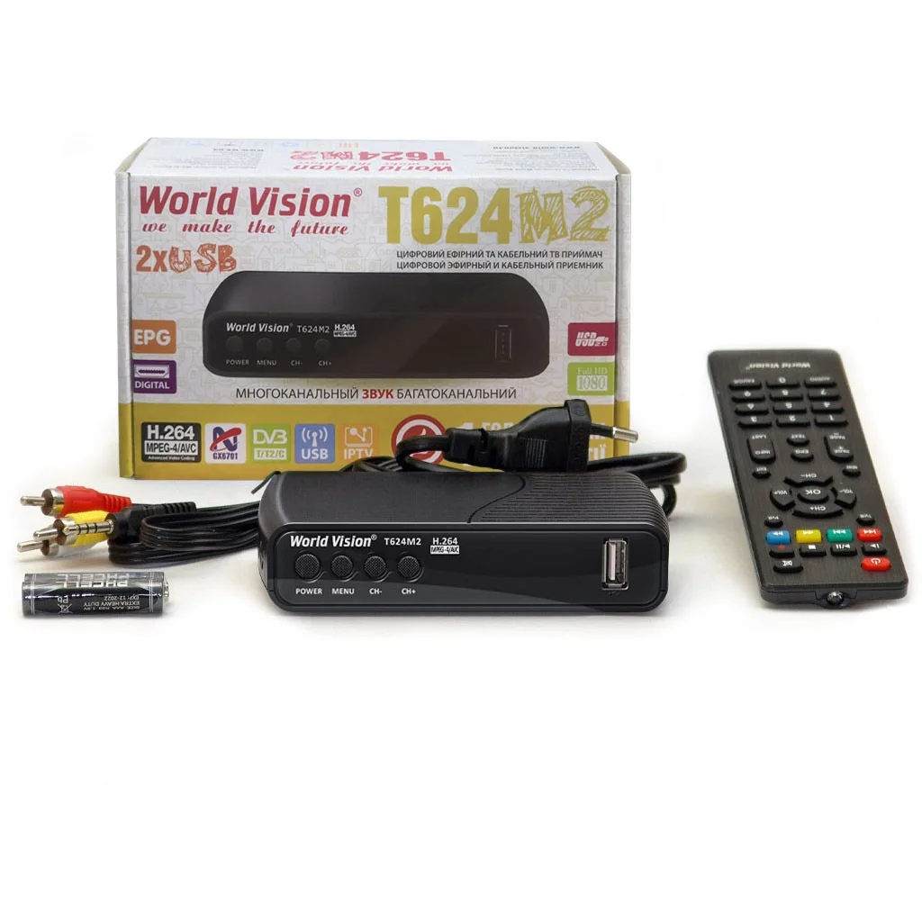 Новинка 2020 года, новая комбинированная телеприставка World Vision T624 M2 базируется на высокопроизводительном процессоре GUOXIN GX6701, поддерживает прием цифрового ТВ в стандартах эфирного DVB-T/T2 и кабельного DVB-C телевидения. Данная модель представляет собой обновлённую модификацию телеприставки T62M2, но уже с новым аппаратным обеспечением, а также графической оболочкой которая по удобству управления не уступает предыдущей, все программные изменения тщательно проработаны и изменены только на повышение стабильности работы нового программного обеспечения. В телеприставке World Vision T624 M2 установлен хорошо зарекомендовавший себя тюнер MaxLinear MXL608, обладает хорошей чувствительностью приёма DVB-T/T2 и DVB-C сигнала, в результате пользователь получает стабильность трансляции и качественное цифровое изображение на экран своего телевизора. Как и во всех новых моделях цифровых телеприставок World Vision, присутствует возможность подключения устройства к беспроводной сети через внешний USB Wi-Fi адаптер, поскольку не все модели адаптеров подходят для реализации такого вида соединения, то подробная информация указана в характеристиках на устройство. При подключении к сети интернет пользователь получит дополнительный программный функционал, это обновление программного обеспечения по сети интернет, информация о прогнозе погоды на неделю в приложении "Погода", плеер IPTV для просмотра интернет трансляций ТВ каналов, онлайн-кинозал Мегого с огромной медиатекой фильмов, сериалов и мультфильмов, RSS новости. Модель World Vision T624 M2 после подключения в USB разъём накопителя памяти, поддерживает всевозможные PVR функции, стандартная немедленная запись телепрограммы, запись по таймеру установленному в ручном режиме или через телегид расписания по программам, отложенный просмотр таймшифт. В программном обеспечении удалось реализовать все функции предыдущего популярного у пользователей модельного ряда Т62, а также модифицировать их, такие, как: синхронизация времени по сети интернет, загрузка в режим ожидания при аварийном отключение электричества, стартовая загрузка телеприставки в режим IPTV плеера, регулировка яркости LED дисплея как в рабочем режиме, так и режиме ожидания. Отличие World Vision T624 M2 перед другими ТВ приставками нового модельного ряда построенного на процессоре GUOXIN GX6701, это отсутствие светодиодного LED дисплея и наличие кнопок управления на лицевой панели корпуса, данная модель занимает бюджетный ценовой сегмент устройств. Программное обеспечение адаптировано таким образом, что подходит на все телеприставки World Vision построенные на платформе GX6701.
