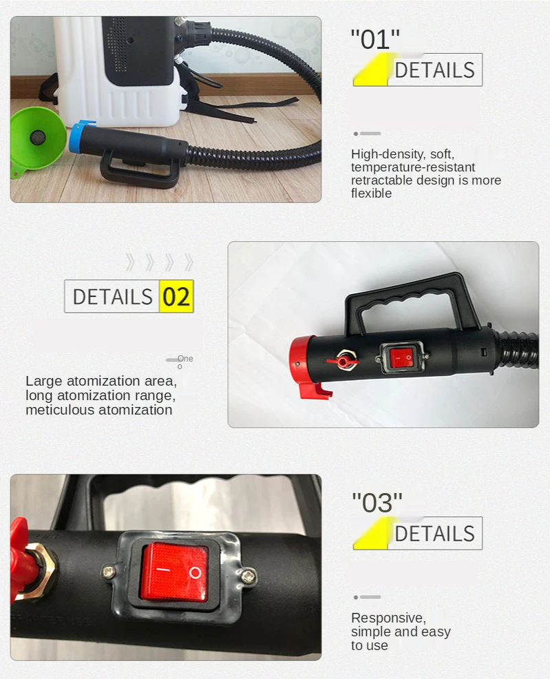 5.With frequency-conversion motor, adjustable delivery lift and noise, the fogger is very chemical saving.