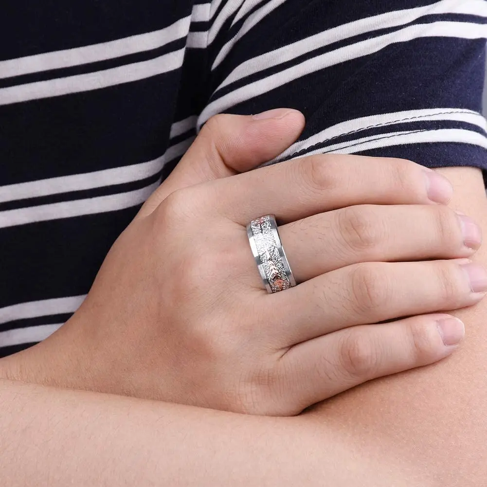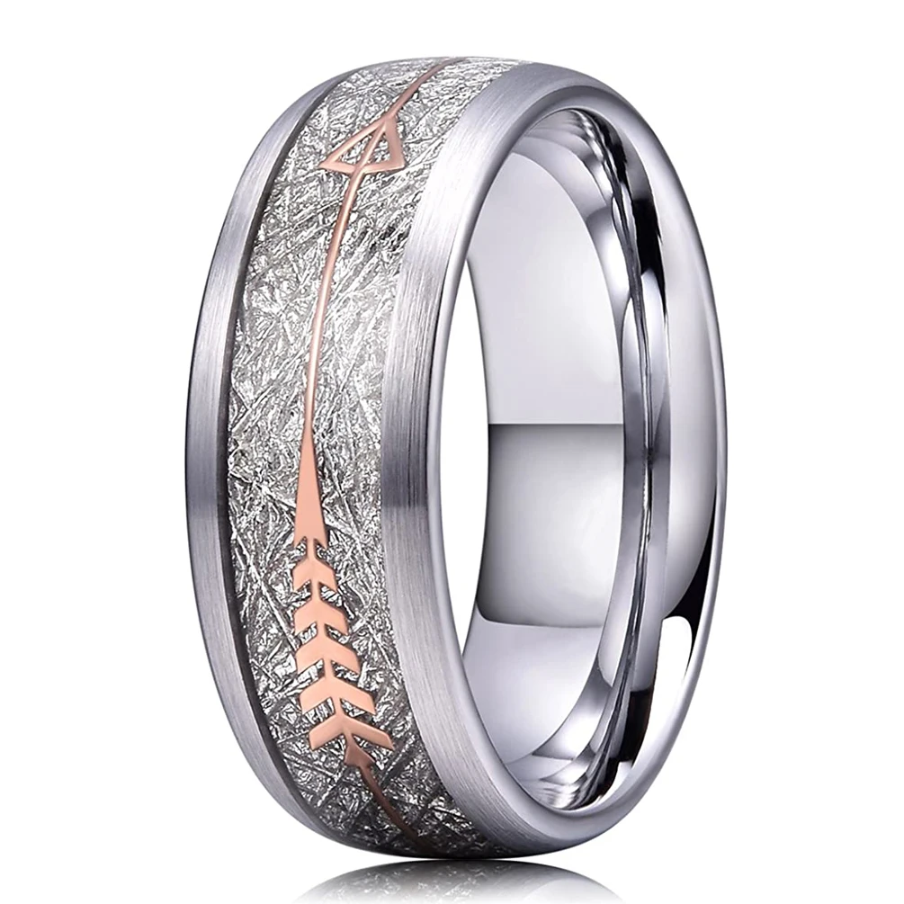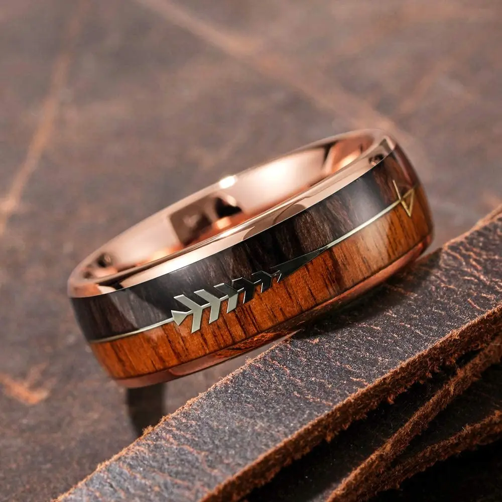 Модное обручальное кольцо 8 мм из розового золота со стрелкой из вольфрама для мужчин и женщин, инкрустация из дерева КОА и абалона, кольцо из опала и стали, мужское обручальное кольцо