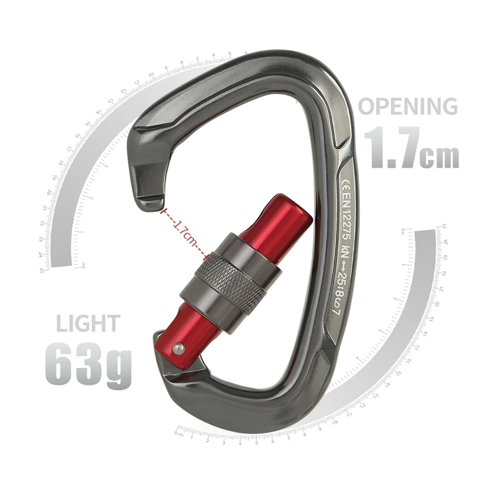 Heavy-duty carabiner: long axis: 25KN (5511lbs), short axis: 8kN, CE/UIAA certification. (Reminder: The grade of carabiner is based on the results of laboratory tests, the actual may be different.)