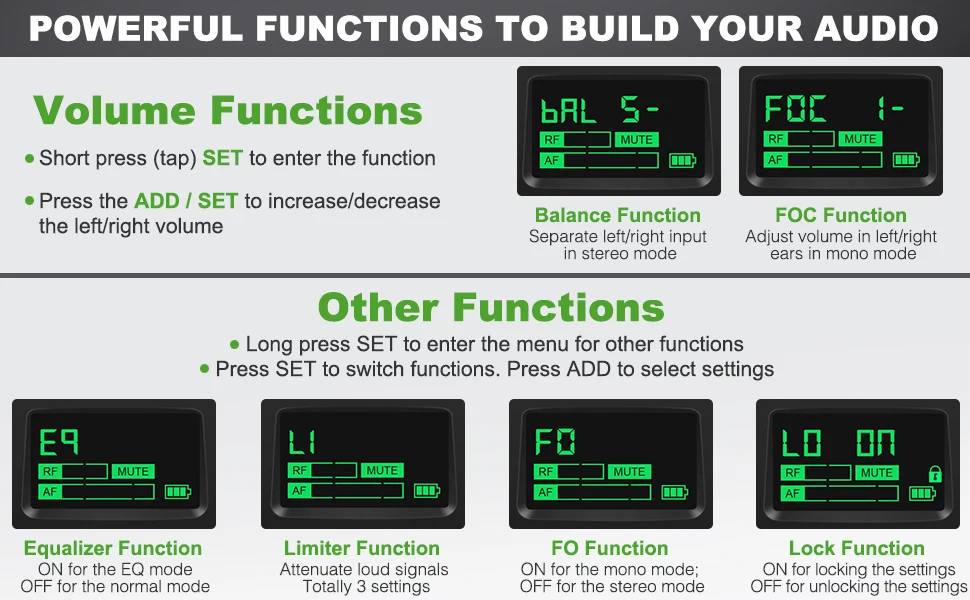 Элегантный гладкий дизайн, металлическая конструкция для базового блока передатчика, черный чехол для переноски для безопасного хранения. ЖК-панель предоставляет информацию о системе, включая канал, номер группы, выбор режима стерео, функцию блокировки и радиочастотный индикатор. Простая настройка с непрерывной частотой для оптимизации звука для этой персональной системы монитора. Наушники хорошего качества обеспечивают более чистый звук и повышенную производительность для студийного и сценического монитора