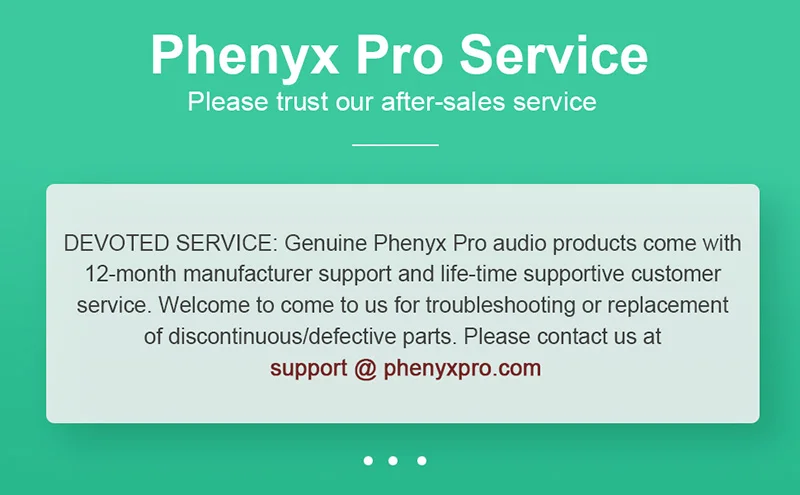 Натуральная Phenyx Pro аудио продукты поставляются с 12-месячной производитель гарантии и поддержку в службу поддержки клиентов. Добро пожаловать к нам для устранения проблем или замены разрывных/дефектных деталей.