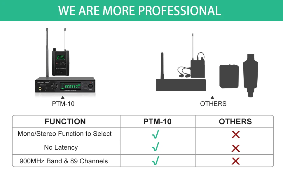 Этот UHF стерео беспроводной в ухо монитор система работает в900 МГцПолоса (905 МГц-925 МГц), без помех, используя UHF широкую передачу аудиосигнала (до 6 систем могут работать одновременно). Беспроводная система позволяет пользователям свободно перемещаться на сцене и в студии с рабочим расстоянием от140 - 160 футов.В открытом пространстве, линии видимости.