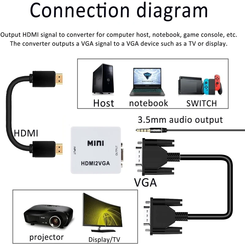 MINI HDMI2VGA-это видео конвертер высокой четкости, который преобразует цифровой сигнал HDMI в аналоговый сигнал VGA и аналоговый аудиосигнал.