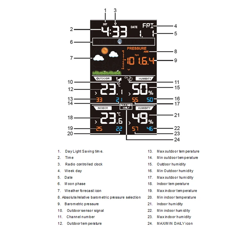 Нажмите кнопку BARO./-, чтобы переключиться на последние 12 часов/24 часа/48 часов/72 часа среднего нажатия. Единицы измерения барометрического давления (hPa, mmHg или inHg)