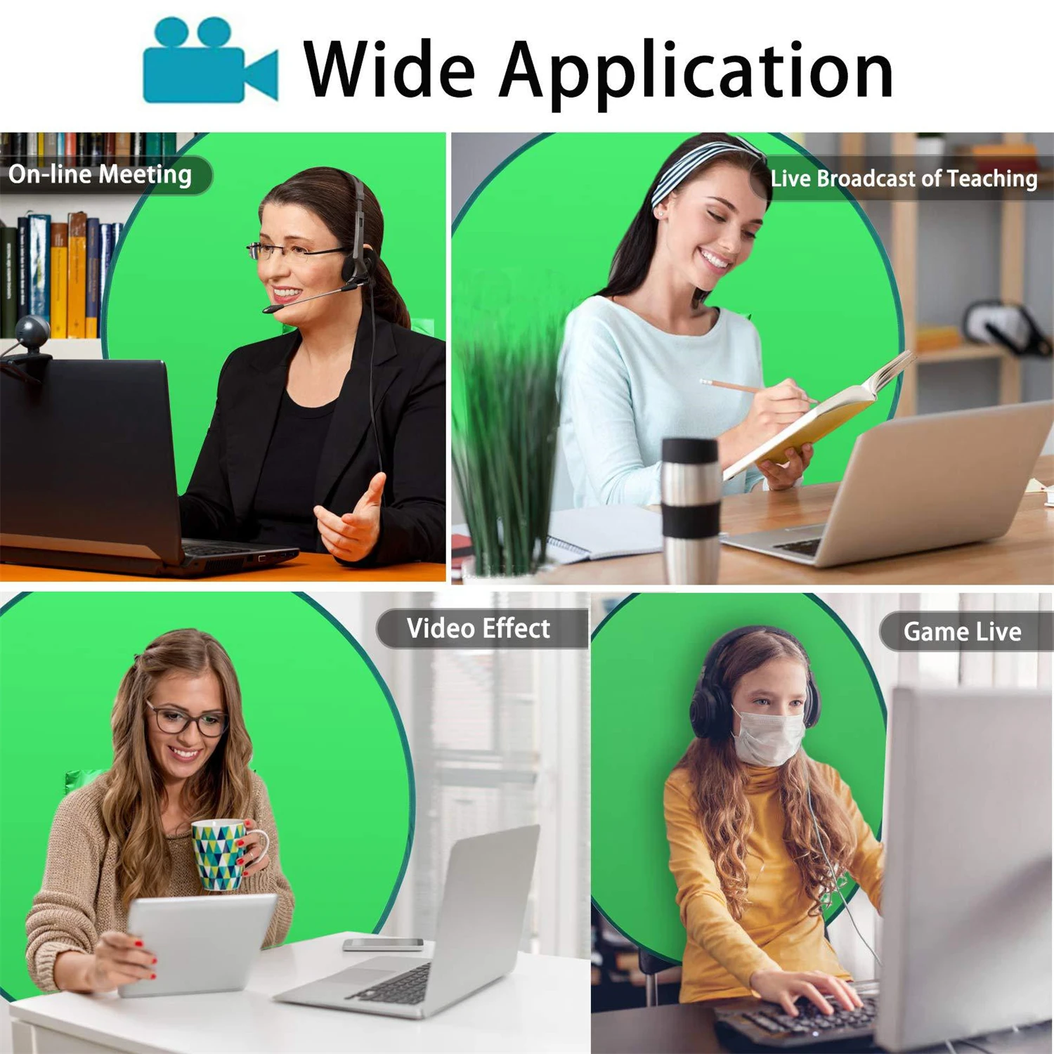 •✔[Отказ от ответственности] Веб-камера может быть увеличена или уменьшена, чтобы покрыть зеленый фон экрана. И равномерно Осветите его, чтобы убедиться, что нет слишком ярких пятен, которые могли бы испортить фоновое изображение.