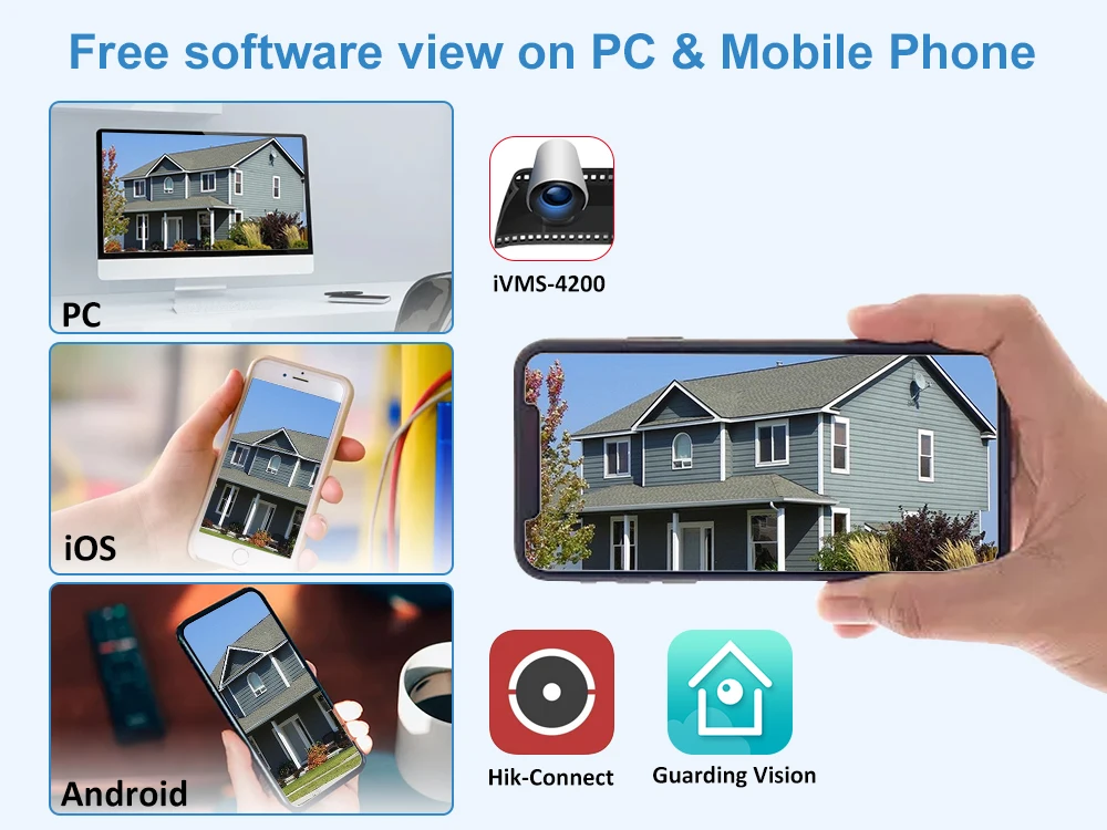 Когда вы выходите на улицу, вам не нужно беспокоиться о вашей безопасности. Используя эту систему камеры, вы можете удаленно просматривать видео в реальном времени одновременно в любое время, в любом месте с Wi-Fi/сотовой сети на смартфоне/iPad/ПК. С помощью бесплатного приложения «Hik-link» или «Guarding Vision». Смотрите прямые трансляции и просматривайте плейбэки мгновенно, помогая вам оставаться в курсе, когда и где бы.