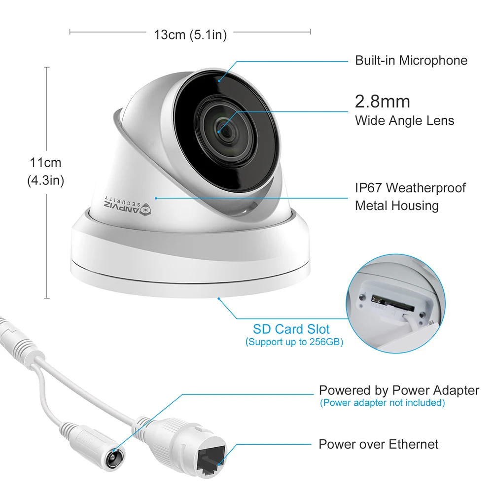 Оснащенная объективом 2,8 мм камера безопасности имеет Диагональный угол обзора 108 °. По сравнению с обычными камерами, объектив которых составляет 4 мм и покрывает только угол обзора по диагонали 98 °, наша камера позволяет вам легко видеть больше углов вашего дома.