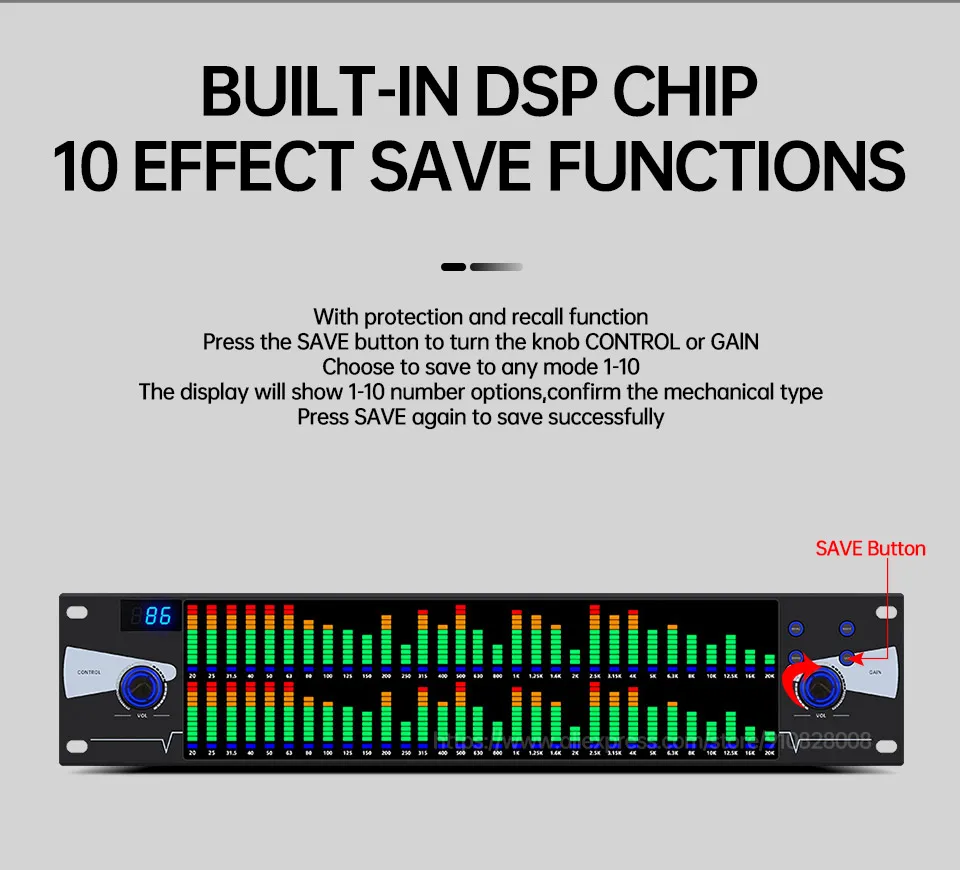 Встроенный чип памяти DSP, вы можете предварительно хранить 10 режимов для вызова. Слегка нажмите кнопку «сохранить», и вы можете повернуть ручку или получить, чтобы выбрать любой режим от 1-10.