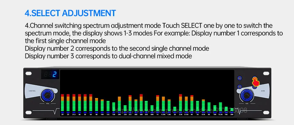 4. Переключение каналов режим регулировки спектра сенсорный выберите один за другим, чтобы переключить режим спектра, дисплей показывает 1-3 режима, например: номер дисплея 1 соответствует первому одноканальному режиму
