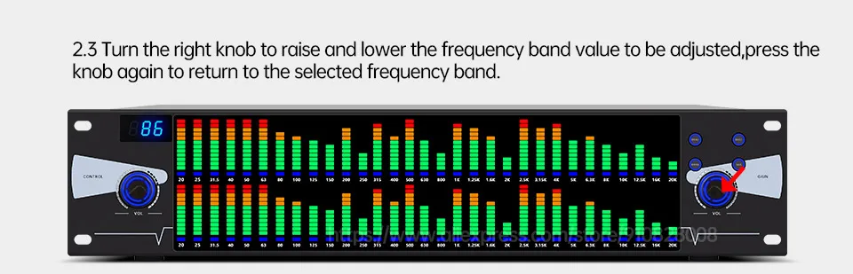 2,3 поверните правую ручку, чтобы поднять и понизить значение частотного диапазона для регулировки, нажмите кнопку снова, чтобы вернуться к выбранному диапазону частот.